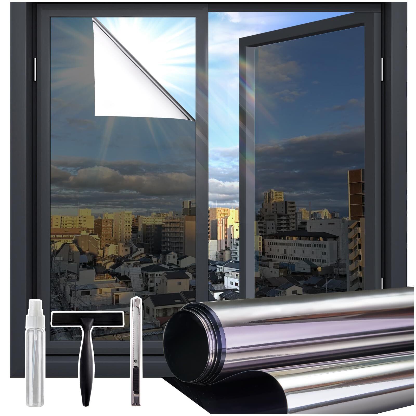 【マジックミラー効果・プライバシー保護】充分な天然の日光を室内に取り込めて明るさを維持しながら、外からの視線を遮ります。大切なプライバシーをきちんと守ります。昼間は外から見ると鏡のように人影を映す同時に、高い目隠し効果を生かします。室内から見ると、紺色の透明シートに見え、視界を損なわず、気軽に外の風景を眺めます。一般家庭のガラス窓、オフィス、会議室、事務室などの目隠し装飾に非常に適用しています。室内が屋外より明るい場合(夜間、照明を使う場合など)には室内が見えますのでご注意下さい