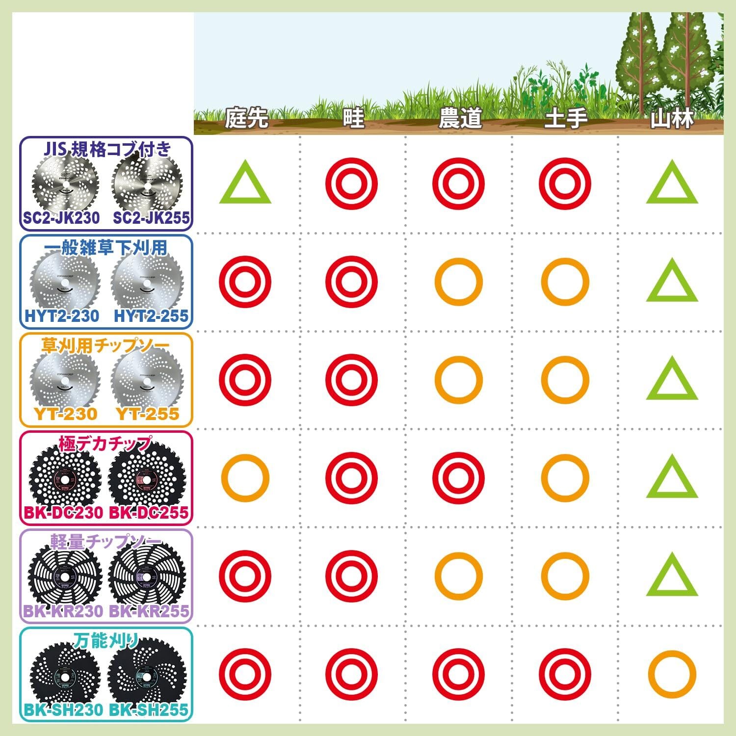 【安心のJIS規格】品質をするJIS(日本工業規格)入りの草刈用チップソーです。芝や雑草、笹、小枝などの一般雑草の下刈に最適です。エンジン排気量20㏄以上の刈払機でご使用できます。