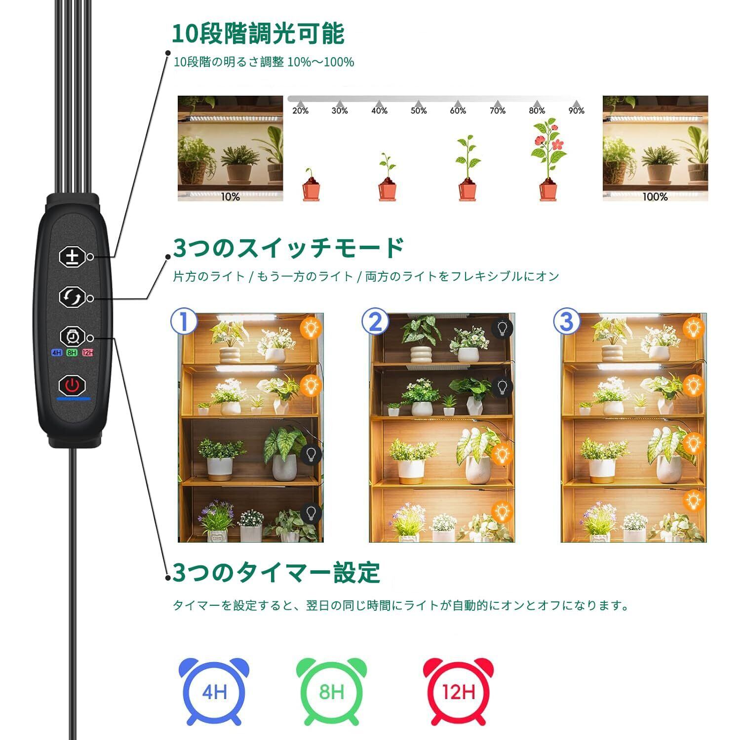 【調光可能】この成長光には調整可能な明るさがあり、10レベルから100%の10レベルの調光オプションを提供します。さまざまな植物の照明要件を満たすために、植物が成長する理想的な照明環境の明るさを簡単に調整することができます。