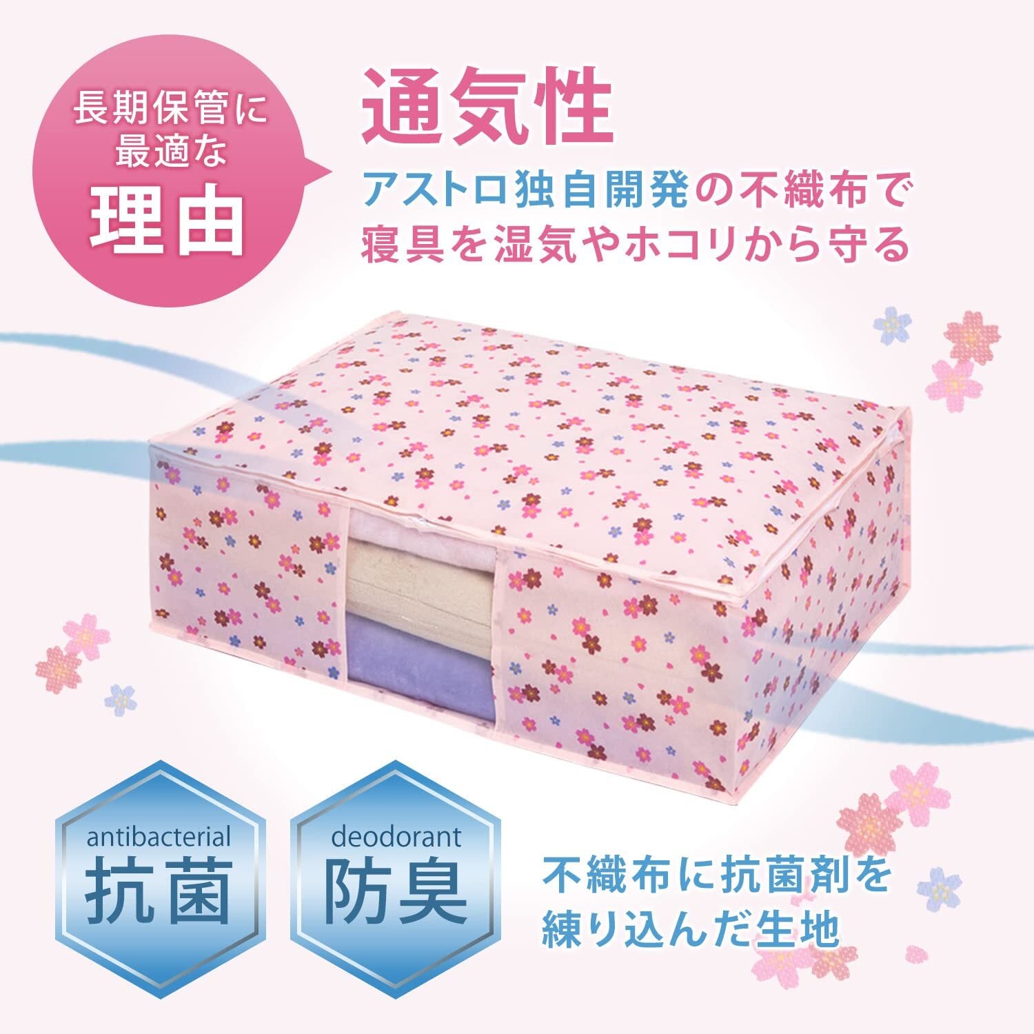 アストロ 抗菌防臭 布団収納ケース 毛布 軽寝具用 2枚組 通気性の良い不織布がホコリなどの汚れをガード 中身の見える透明窓付き 布団収納 布団袋 収納ボックス 収納袋 引っ越し クローゼット 押し入れ ピンク さくら柄 197-22