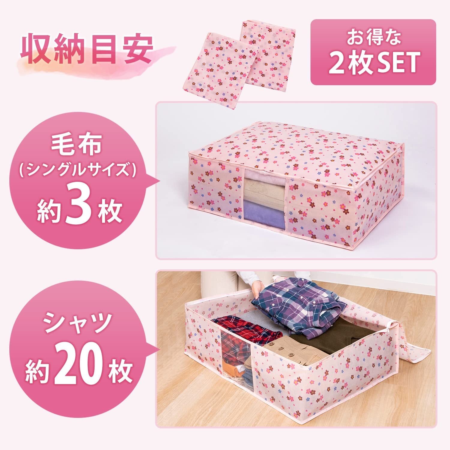 【商品仕様】:サイズ/約幅70×奥行53×高さ23cm、カラー/ピンク、柄/さくら柄、内容/2枚、収納目安/厚手毛布約2枚・薄手毛布約3~4枚、材質/ポリプロピレン(抗菌剤練り込み)・ポリエチレン
