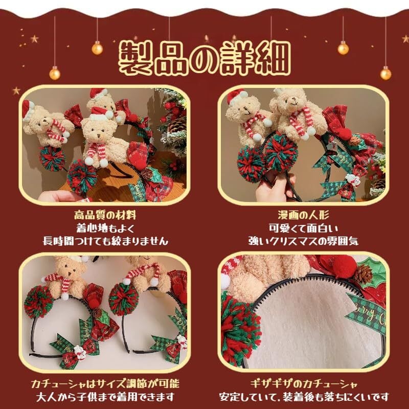 【イベントやパーティーの必須アイテム!】このカチューシャは、クリスマスの雰囲気をたっぷり味わうための便利な小道具です。前髪留めとしても使えるので、アクティブに動いても安心。一つ持っていると、どんなイベントも思い出深いものになること間違いなしです!