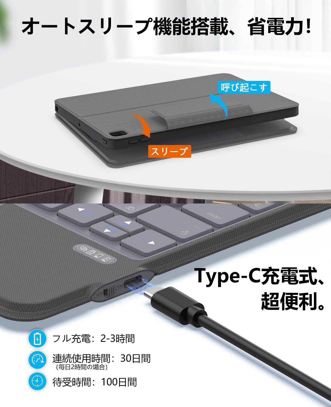 【省電力デザイン】 ipad air3 キーボードはオートスリープ機能搭載なので、ケースを閉じるとiPadがスリープモードに入り、省エネです。ipad キーボードは、不使用時に電源スイッチをオフにして電力消耗を防止できます。ipad pro キーボードはType-C充電式、2-3時間でフル充電ができます。日常程度(1日2時間使用)の場合は、30日間の持続使用と100日間の待受は可能になります。