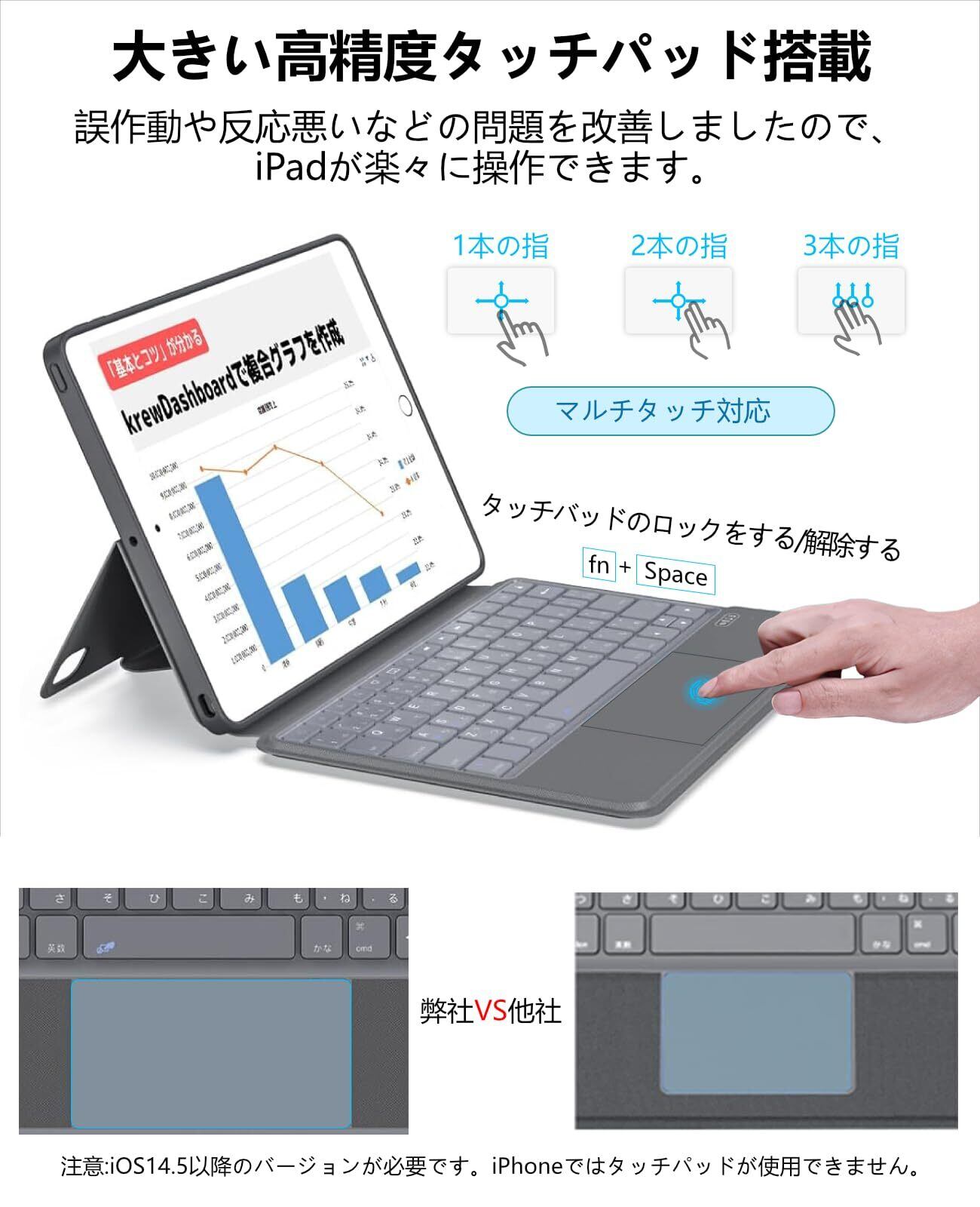 【磁気吸着&脱着式全面保護ケース&スタンド機能付き】 ご注意:iPhoneではトラックパッドが使用できませんが、予めご了承ください。iPad本体が付属しないのです。この10.2/10.5インチiPad用キーボード付きケースは、カバーと保護ケースに強力なマグネットを内蔵し、しっかり吸着させます。ipad キーボード付きケースのカバー材質が丈夫で手触りも良いです。保護ケースは脱着式で、キーボード必要ない時に便利さアップ!全面保護、大切なiPadを傷や汚れからしっかり守ります。ipad air キーボード付きケースはスタンド機能搭載で、iPadを立てかけることができ、横置きも縦置きもOK、映画鑑賞にはもちろん、仕事用や勉強用にもおすすめ!