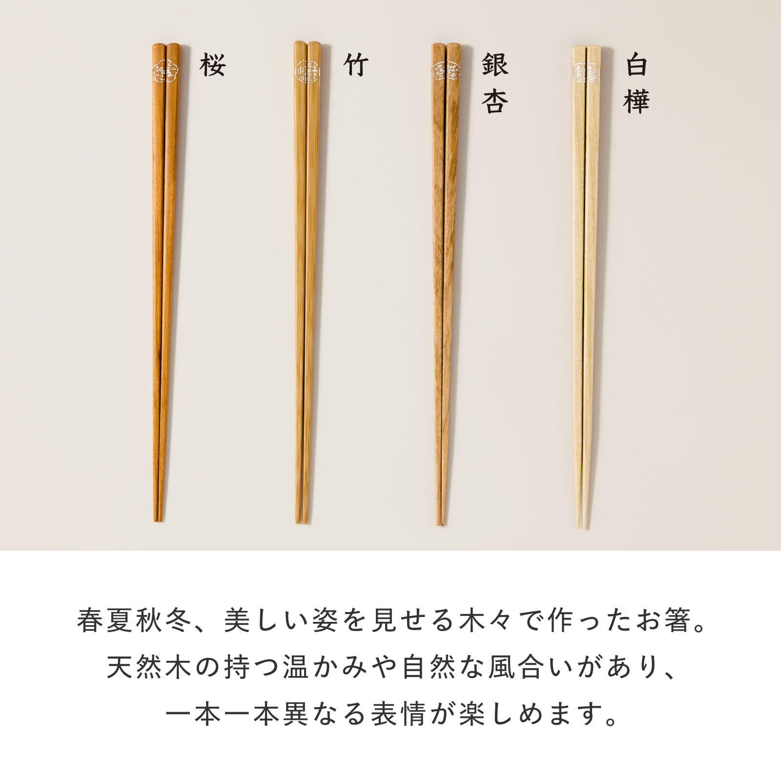【素材】・箸:天然木(桜/ 竹/ 銀杏/ 白樺)・箸の表面塗装:ポリエステルウレタン樹脂・パッケージ:紙