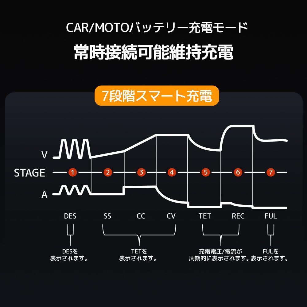 充電機能:7段階全自動スマート充電・バッテリー診断・急速充電・冬·夏 スマート充電・パルス修復モード・7段階式充電(パルス充電・ソフトスタート 充電・定電流充電・定電圧充電・テスト充電・補充充電モード・フロート充電モード)