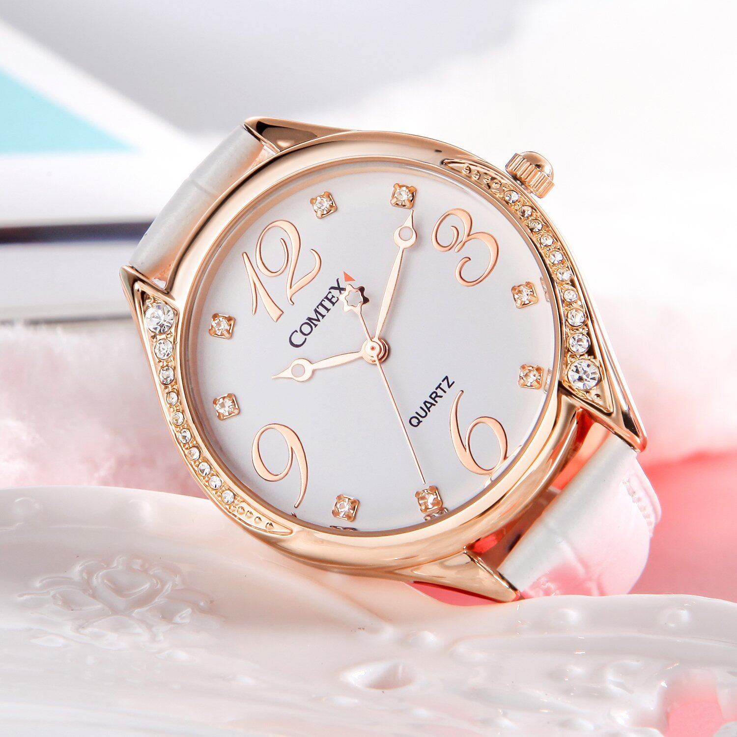 【特価商品】Comtex 腕時計 ホワイト皮革 バンド ウォッチ ローズゴールド 可愛い 丸い 時計 レディース