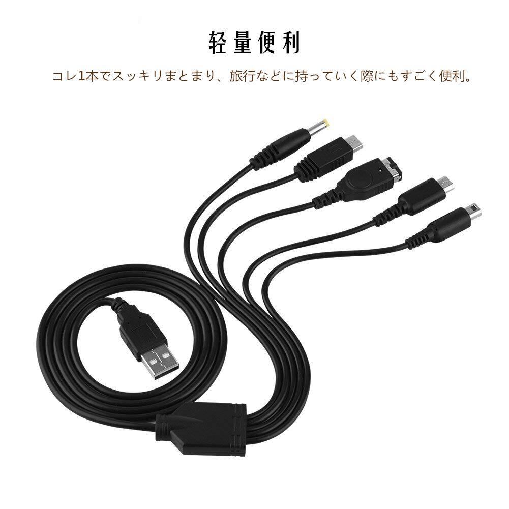 5 in 1 USB 充電ケーブル ニンテンドー New 3DS(XL/LL), 3DS(XL/LL), 2DS, DSi(XL/LL), GBA SP, Wii U, PSP 1000/2000/3000に対応充電ケーブル 1.2m マルチゲームUSB充電ケーブル ブラック