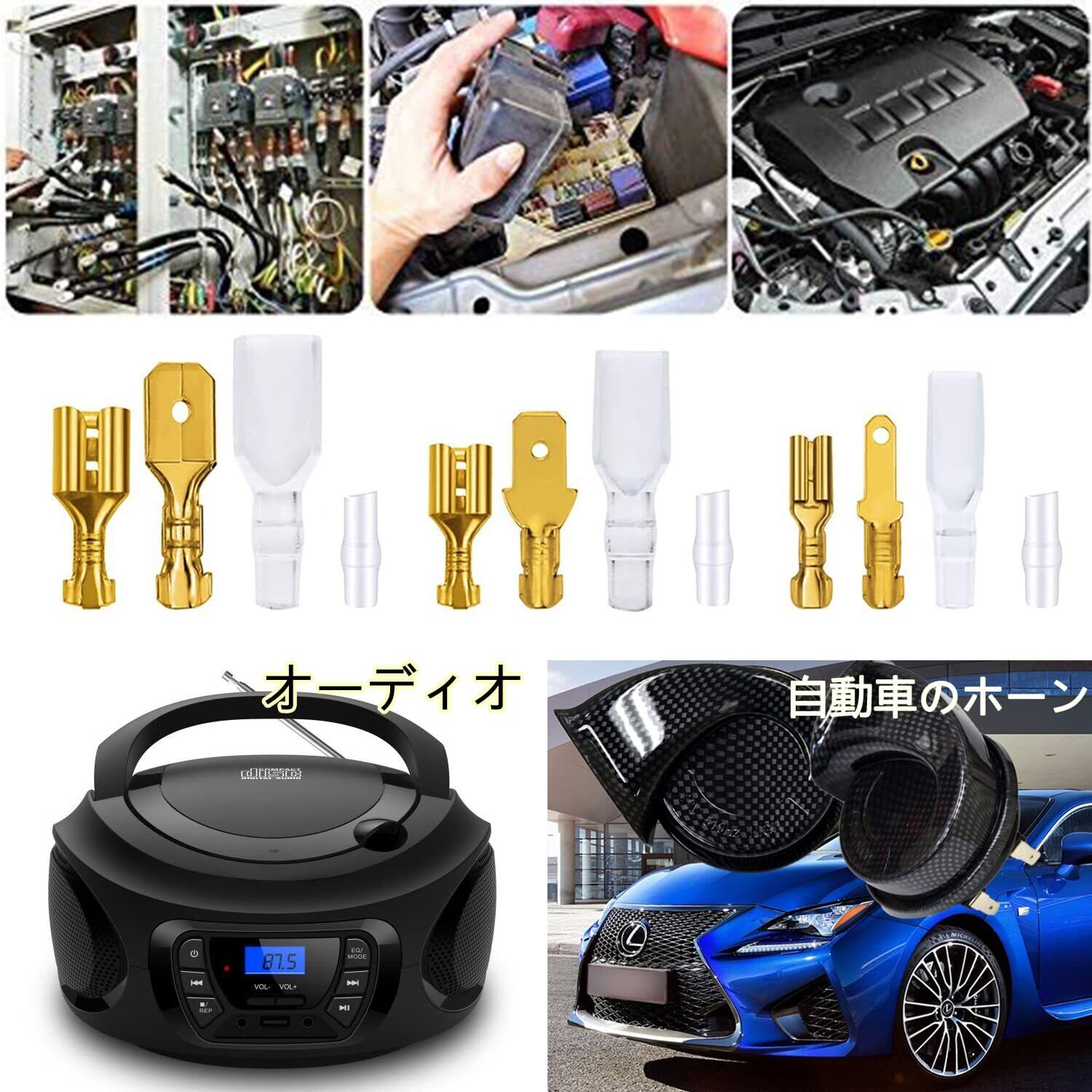 【在庫処分】平型端子セット 480個 金色のオス/メス セット 110型 187型 250型 絶縁スリーブ カバー付き 接続 圧着 ファストン 端子 コネクター 自動車 バイク スピーカー
