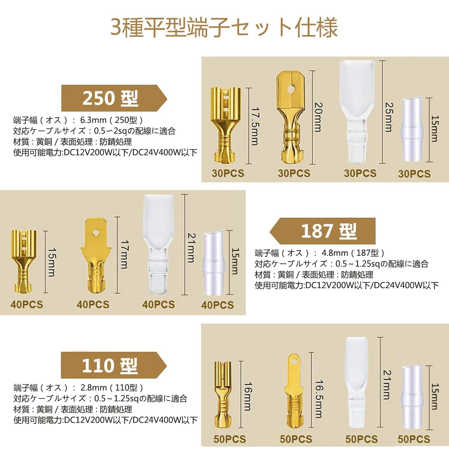端子幅(オス):2.8mm/4.8mm/6.3mm(110型/187型/250型)