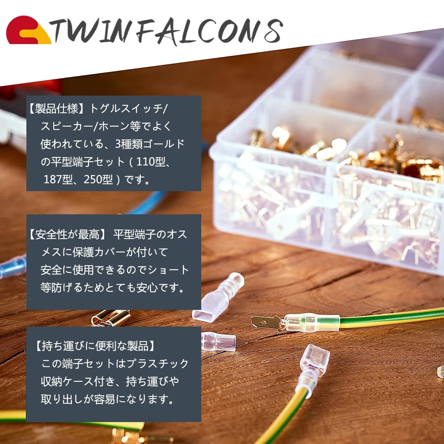 【幅広く適用】この端子セット(110型・50個、187型・40個、250型・30個)はプラスチック収納ケース付き、持ち運びや取り出しが容易になります。自動車、バイク、交通、機械、配電、電気、電子業界、家庭用及び新能源産業などに広く適用される。自動車や家庭用ケーブルの接続にも適用です。
