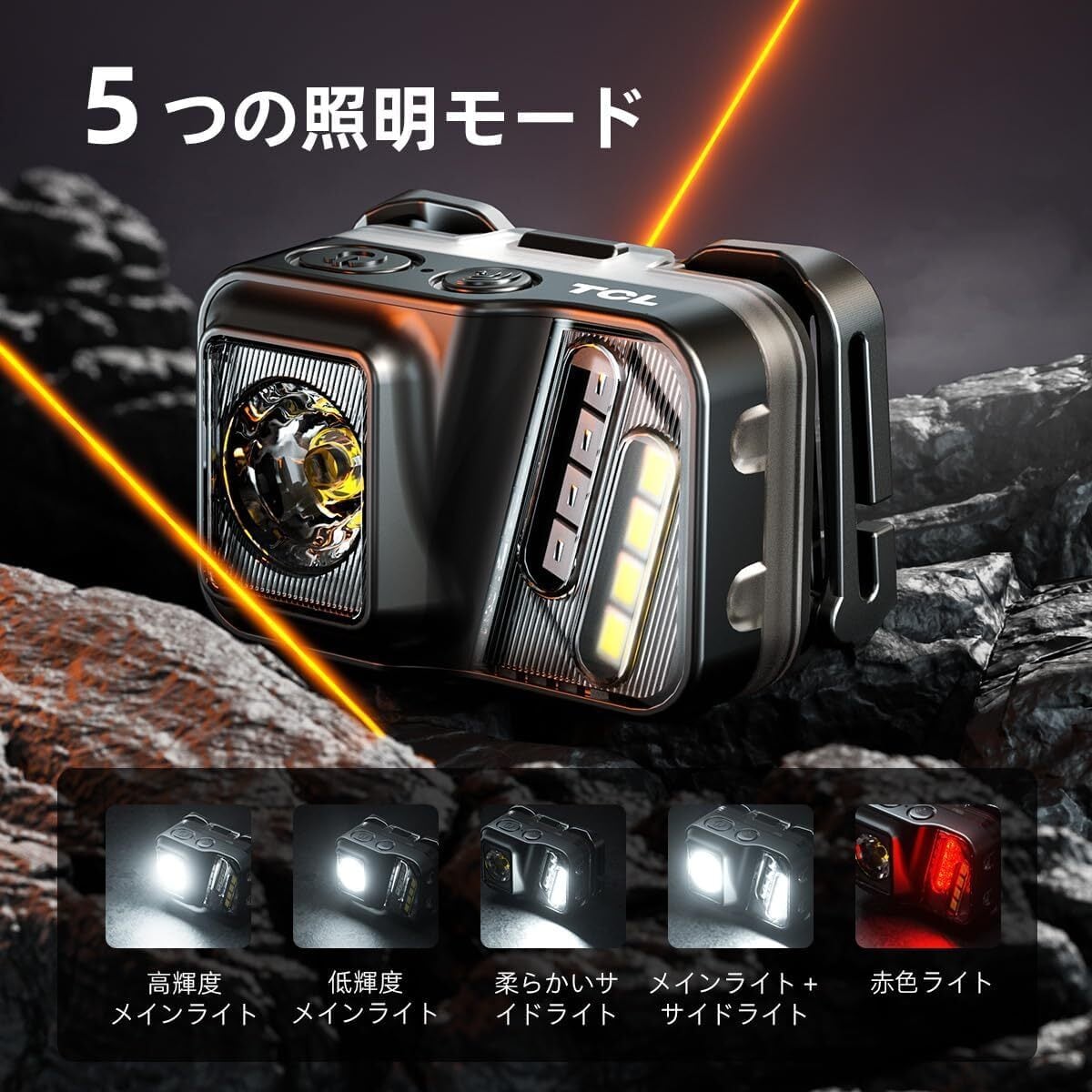 5つの点灯モード - 強メインライト|弱メインライト|ソフト側面ライト|メイン+側面ライト|赤色ライト。近距離照明、広範囲照明、緊急時に切り替えて使用可能。