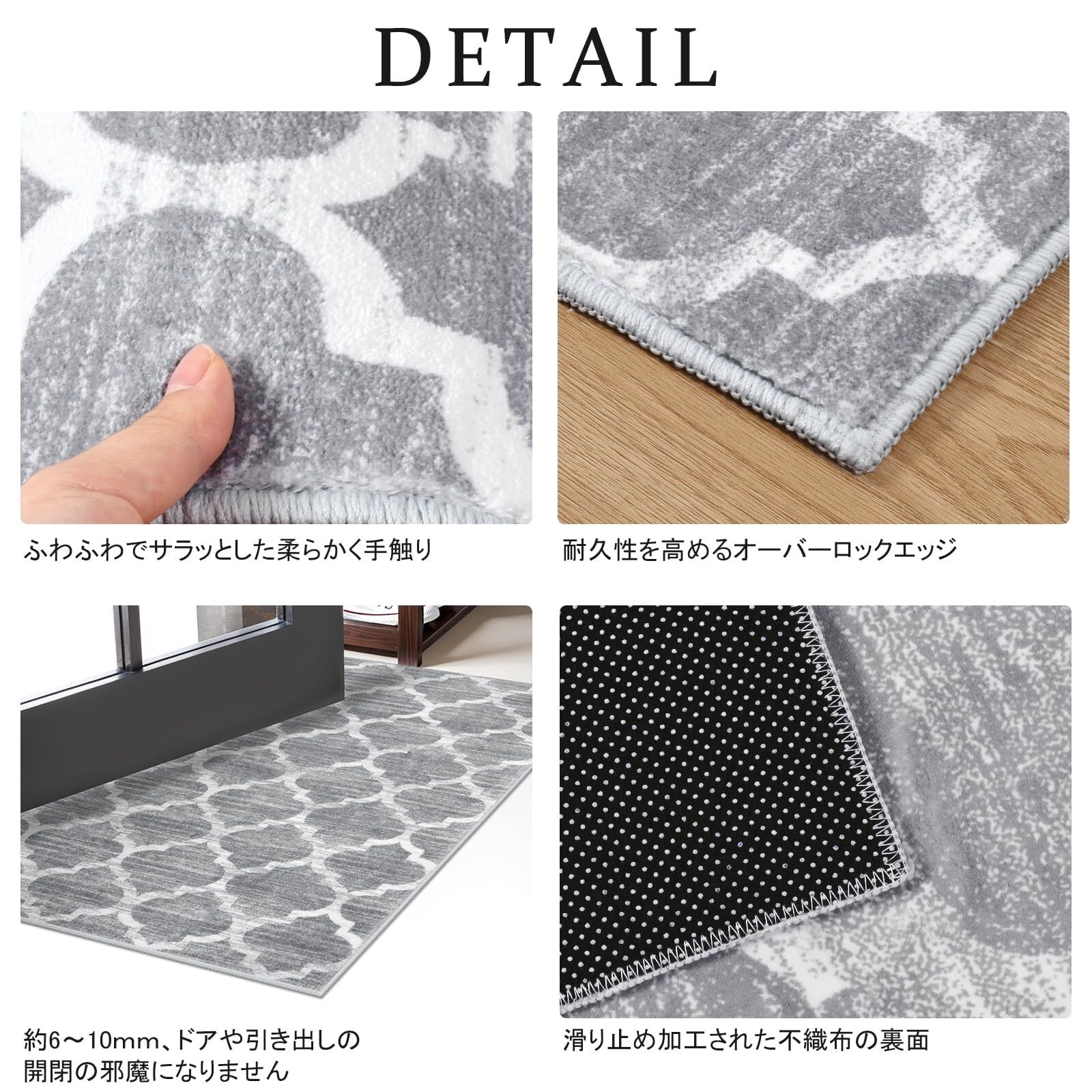 【商品仕様】サイズ:50x80cm、厚さ:約6~10mm、表面素材:100%ポリエステル。裏面素材:不織布(すべり止め加工)。オーバーロック加工の端、遊び毛が出たり、形を崩れたりしにくい。梱包:折り畳み。