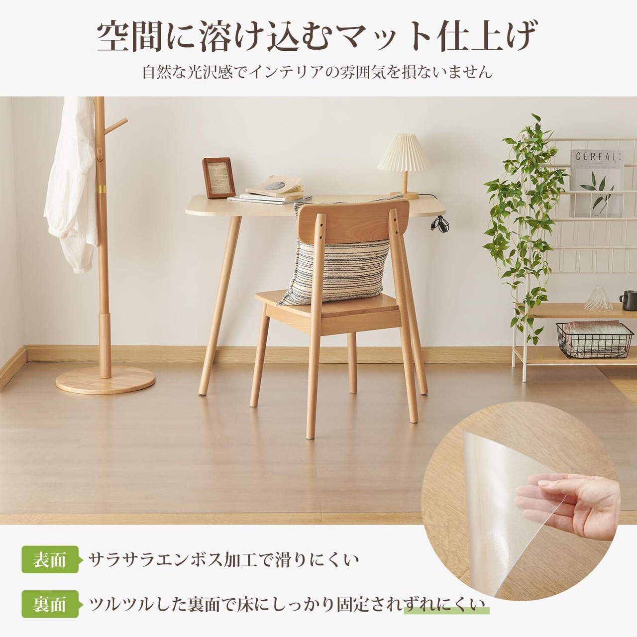 【安定感抜群の滑り止め設計!】このチェアマットはズレない特別なエンボス加工が施されており、安心して椅子を動かすことができます。薄型設計ながらも硬さを持ち合わせており、カラーやデザインを問わず様々な椅子にマッチします!
