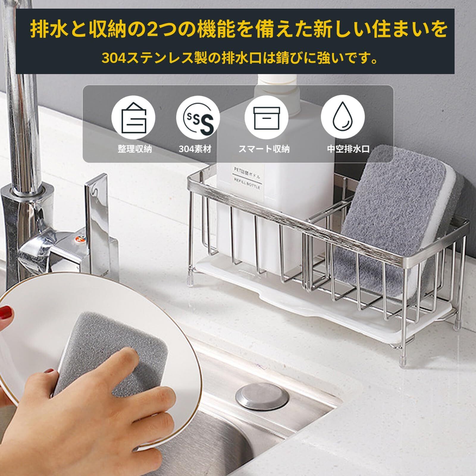 【しっかりとした安定感!】このスポンジラックは、スポンジやたわしをしっかりと支え、キッチン周りをすっきりと整理整頓します。使いやすいサイズで、洗剤ボトルや他の小物も一緒に収納可能です。キッチンが広く使えるようになり、料理の効率もアップします!