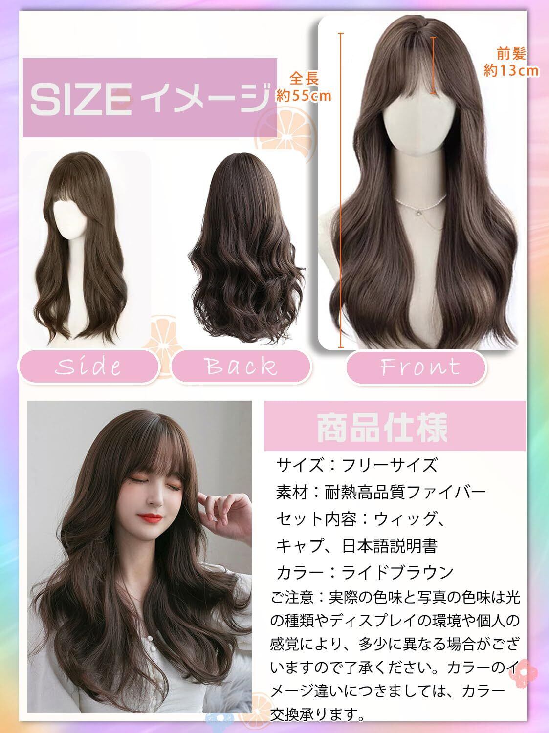 【ウィッグサイズ】:①前髪:つむじから約13CM,後ろ髪:つむじから約55CM。②頭周り:最大約56~58㎝、アジャスター付きなので、個々の頭の大きさに合わせて段階調節することができます。③カラー:ライトブラウン④素材:高品質耐熱ファイバー。⑤同梱内容:ウィッグ/ウィッグネット/日本語使用説明書。ご注意:実際の色味と写真の色味は光の種類やディスプレイの環境や個人の感覚により、多少に異なる場合がございますので了承ください。カラーのイメージ違いにつきましては、カラー交換承ります。