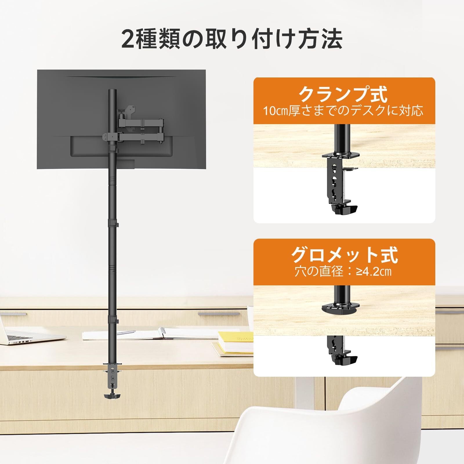 【組立・取付簡単】2取り付け方法:①デスククランプ:頑丈な「C」クランプ(10cm厚さのデスクに適合)は、画面をしっかりと安全に固定し、最高の安定性を提供します。 ②グロメットベースの取り付け:ボルト貫通穴のあるデスクに適合します(穴の最小径は4.2cmです)。 グロメットベースは1.5cmから10cmまでのデスクの厚さをサポートします。商品の組立てはビデオを参照できます。