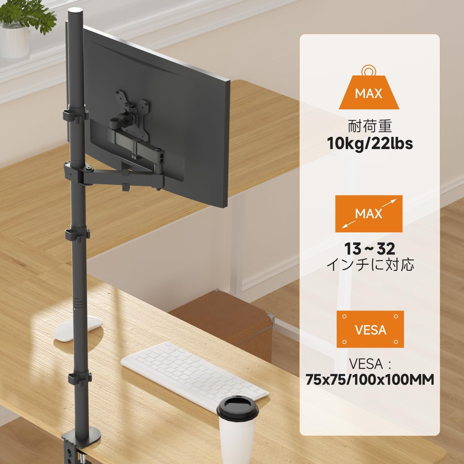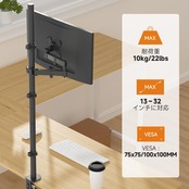【対応モニター】液晶モニターを1画面設置できるディスプレイアームです。耐荷重は10KGで、VESA規格は75×75mm/100×100mmで、13~32インチPCモニターに対応します。
