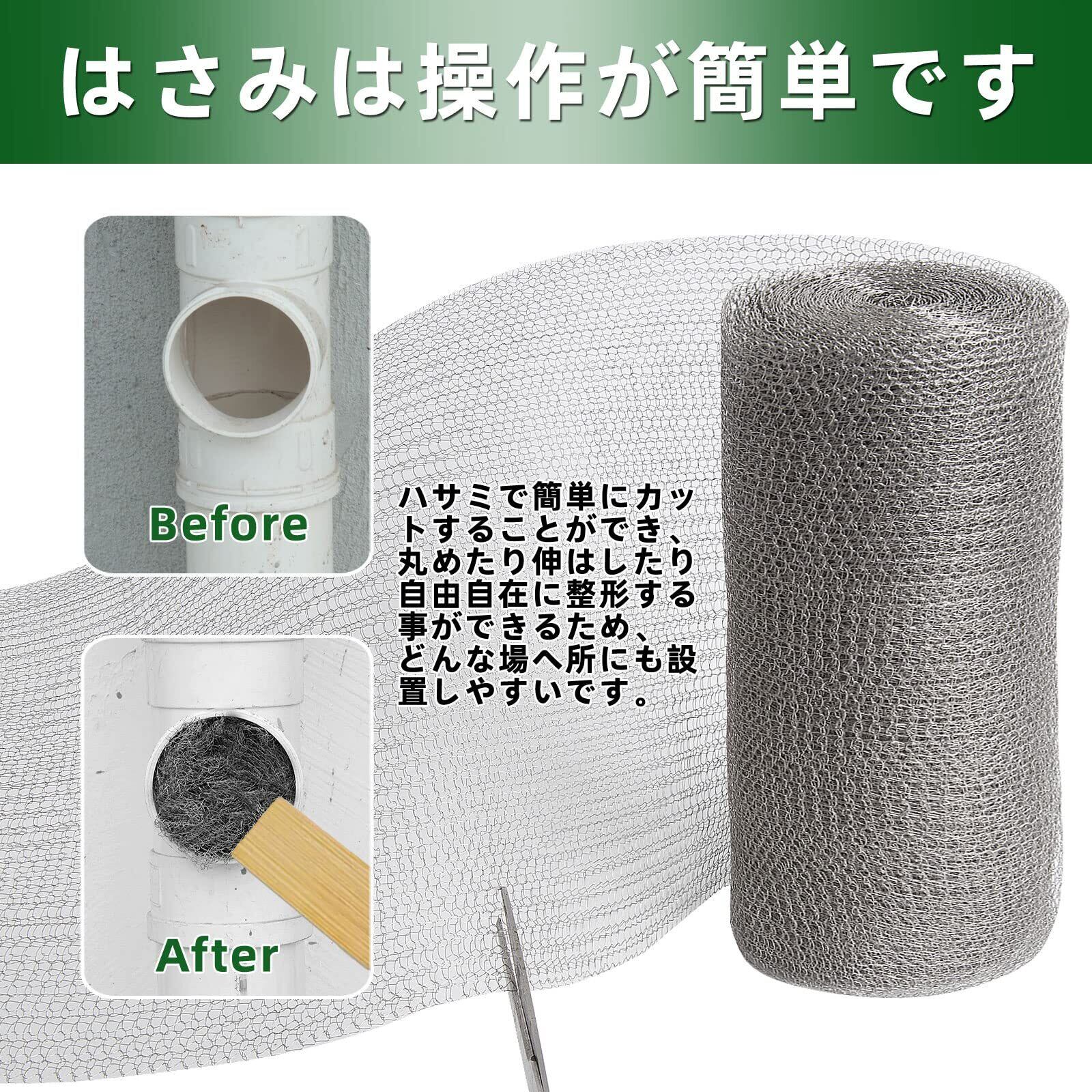 【高品質の素材】優れた304錆びずステンレス糸で作らており、粘り強くて柔らかい、銅メッシュより良好な耐用性と錆防止効果。錆びること心配なく、室外の使用に相応しい。壁やコンクリート、屋根裏の隙間など、より様々な場所にお使いいただける様になりました。