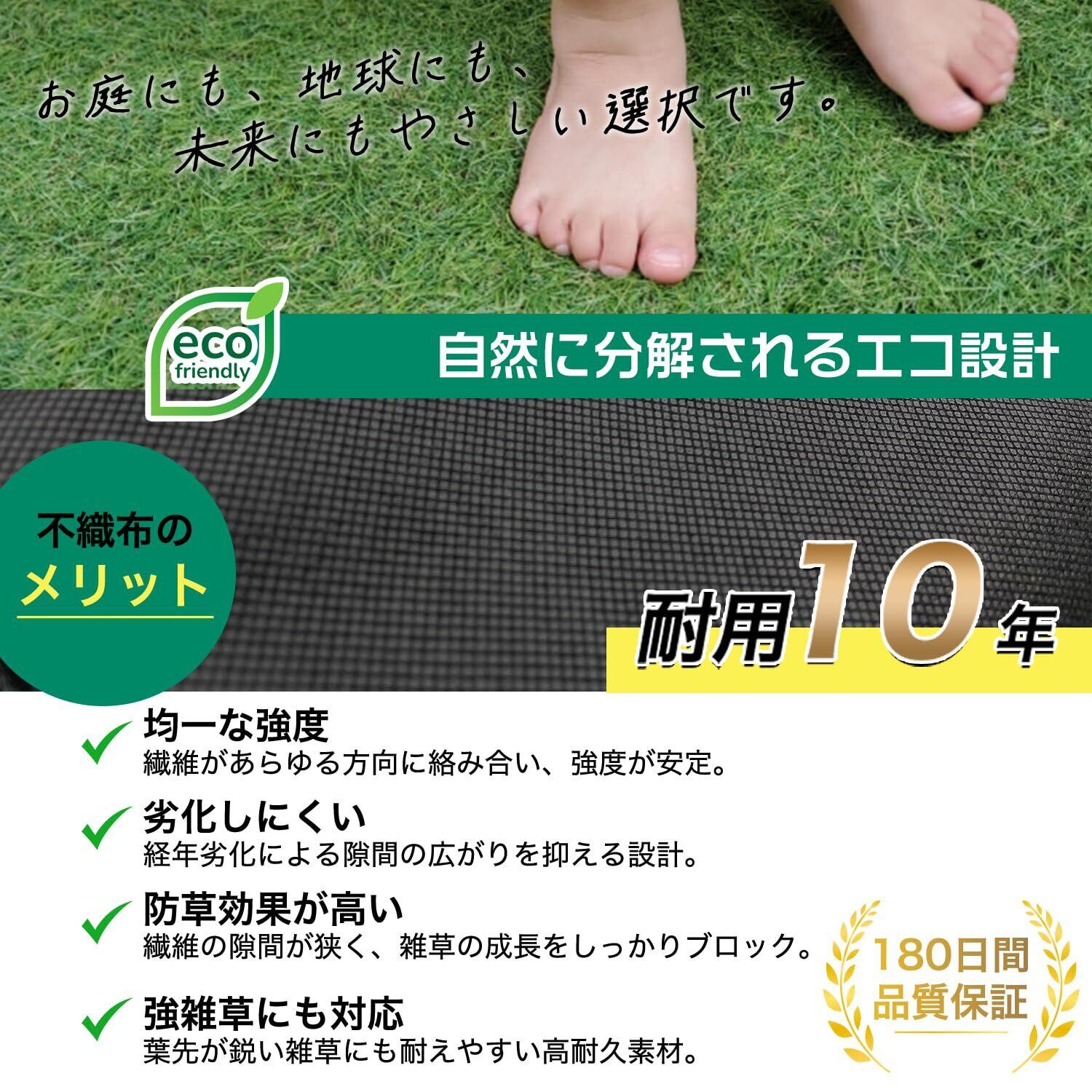 【除草剤不要・環境にやさしい・簡単カット】 除草剤を使わずに雑草の繁殖を抑えられるため、ペットのいるご家庭や家庭菜園にも安心。生分解性の不織布素材を使用しており、使用後は土に還り、環境にもやさしい仕様です。カッターやハサミで簡単にカットでき、カット面がほつれにくく、美しく仕上がります。DIYが苦手な方でも扱いやすいのが特長です。