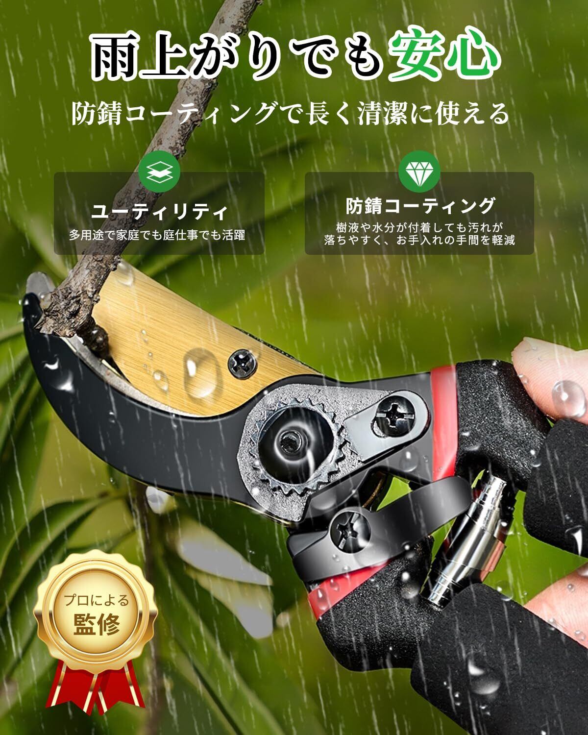 【防錆コーティングで汚れに強く、清潔に長く使える設計】刃には特別な防錆仕上げを施しており、湿気の多い梅雨や雨の日の後でも安心して使用できます。樹液やヤニが付着しにくく、作業後の拭き取りも手早く済ませられます。また、屋外での使用頻度が高い方にも頼れる耐久性を備えており、毎回のお手入れが簡単になります。さらに、見た目にも清潔感を保てるため、剪定鋏や枝切りバサミを長く愛用したい方にぴったりです。