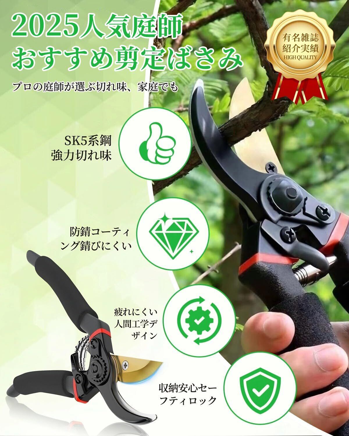 【2025人気庭師推薦・プロ造園士監修】剪定バサミ 剪定鋏 SK5高炭素鋼 超鋭い切れ味 耐久性5倍 軽量アルミ 錆びにくいフッ素加工 合金グリップ 疲れにくい人間工学設計 女性も使いやすい 園芸はさみ 枝切りバサミ 果樹 庭木 盆栽 ガーデニング 観葉植物 プレゼント用