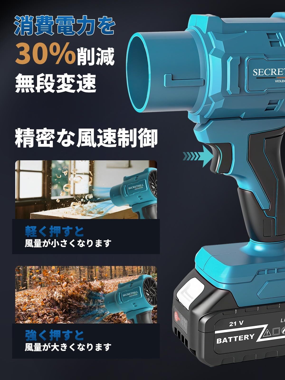 【パワフルな性能】この電動ブロワーは高品質の純銅製モーターを搭載し、高硬度で耐摩耗性に優れた構造が、安定した動作と高い信頼性をします。さらに最上位のターボファン技術を融合することで、圧倒的な送風力を実現し、これにより作業効率が大幅に高まるだけでなく、機械の寿命が大幅に延びると同時に、消費電力も抑えられます。