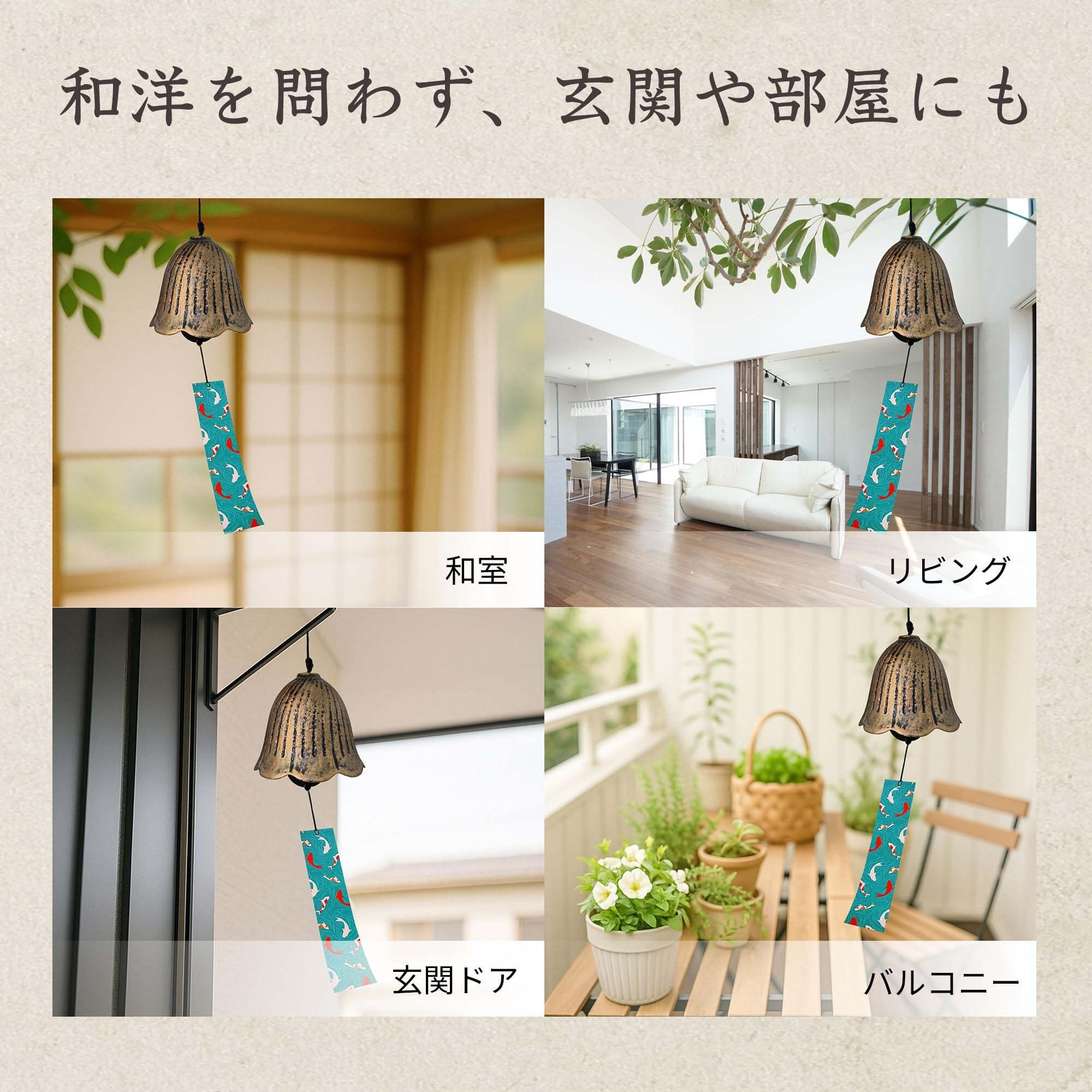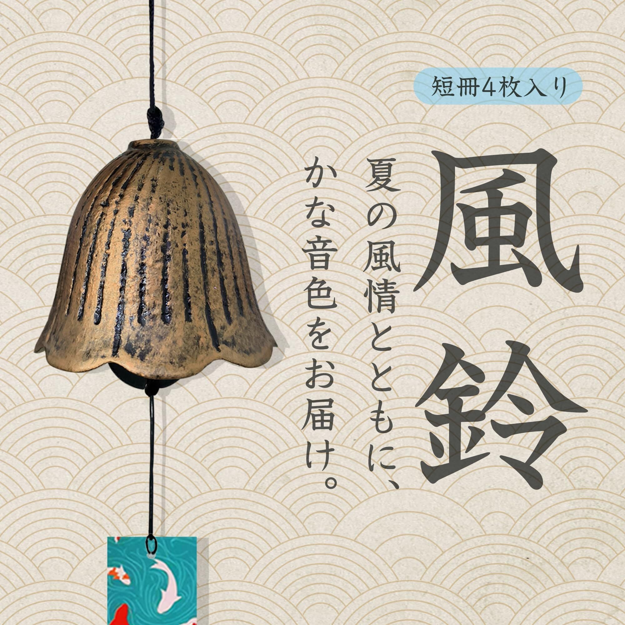 【多様なシーンで楽しめる!】この風鈴は、ベランダや庭先、室内の窓辺など、様々な場所で楽しめます。短冊4枚付きで、さらにアレンジを楽しむことができるのも魅力の一つです。夏祭りやお盆のシーズンには特に活躍し、和の雰囲気を一層引き立てます。