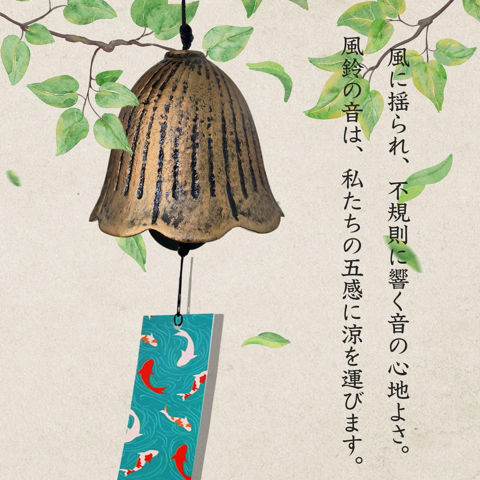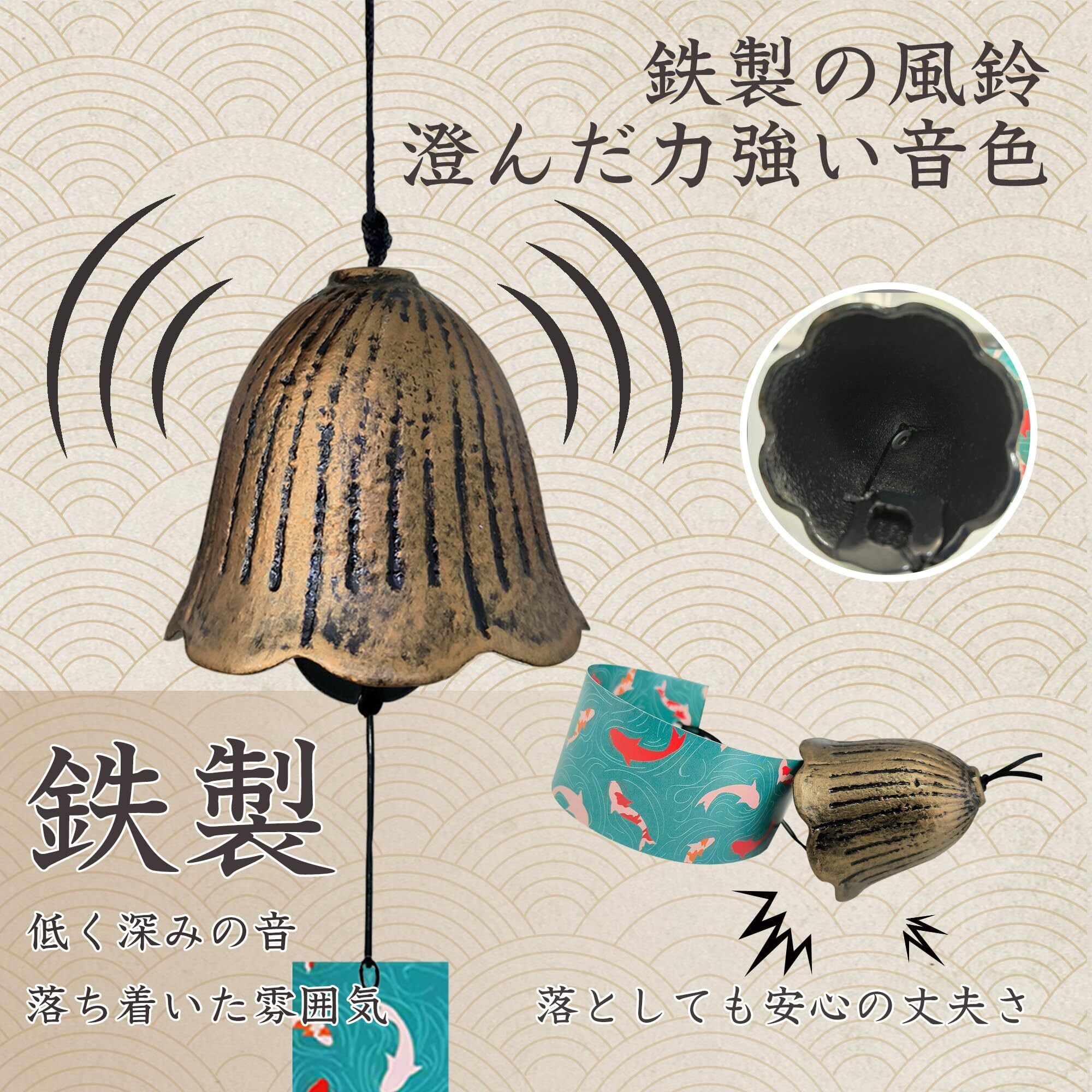 ※【個体差について】 本製品は、職人の手によって一つ一つ丁寧に作られた鉄製の風鈴です。手作りのため、風鈴の色味や形状には若干の個体差がございます。また、若干の歪みや凹凸が見られることがありますが、使用上の問題はございません。
