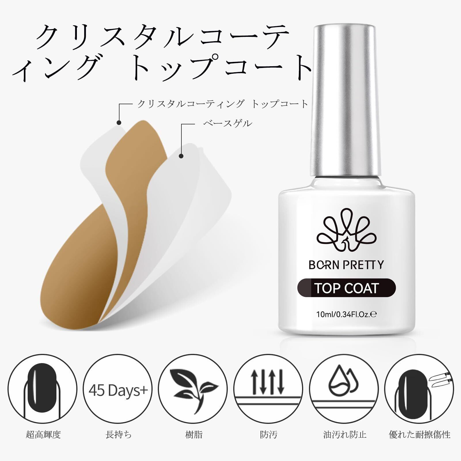 【在庫処分】BORN PRETTY ジェルネイル トップコート ベースコート 10ml 2本セット ノンワイプ 拭き取り不要 大容量 ジェルネイル用 UV/LED対応 カラージェルネイル