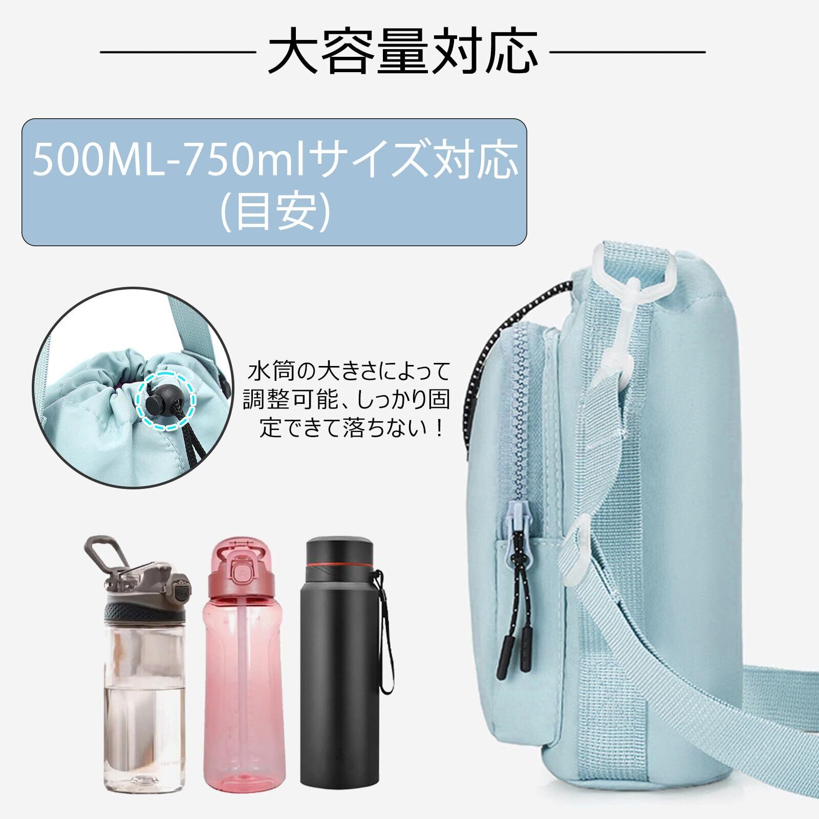 【多機能&大容量対応】500ml-750mlサイズの水筒まで幅広くご使用いただくほか(幅の広い水筒なら1000mlまで対応可能)、前側にファスナー付きのポケットがあり、両手を更に解放させ、鍵、スマホなどの持ち運びがちの物も簡単に収納!