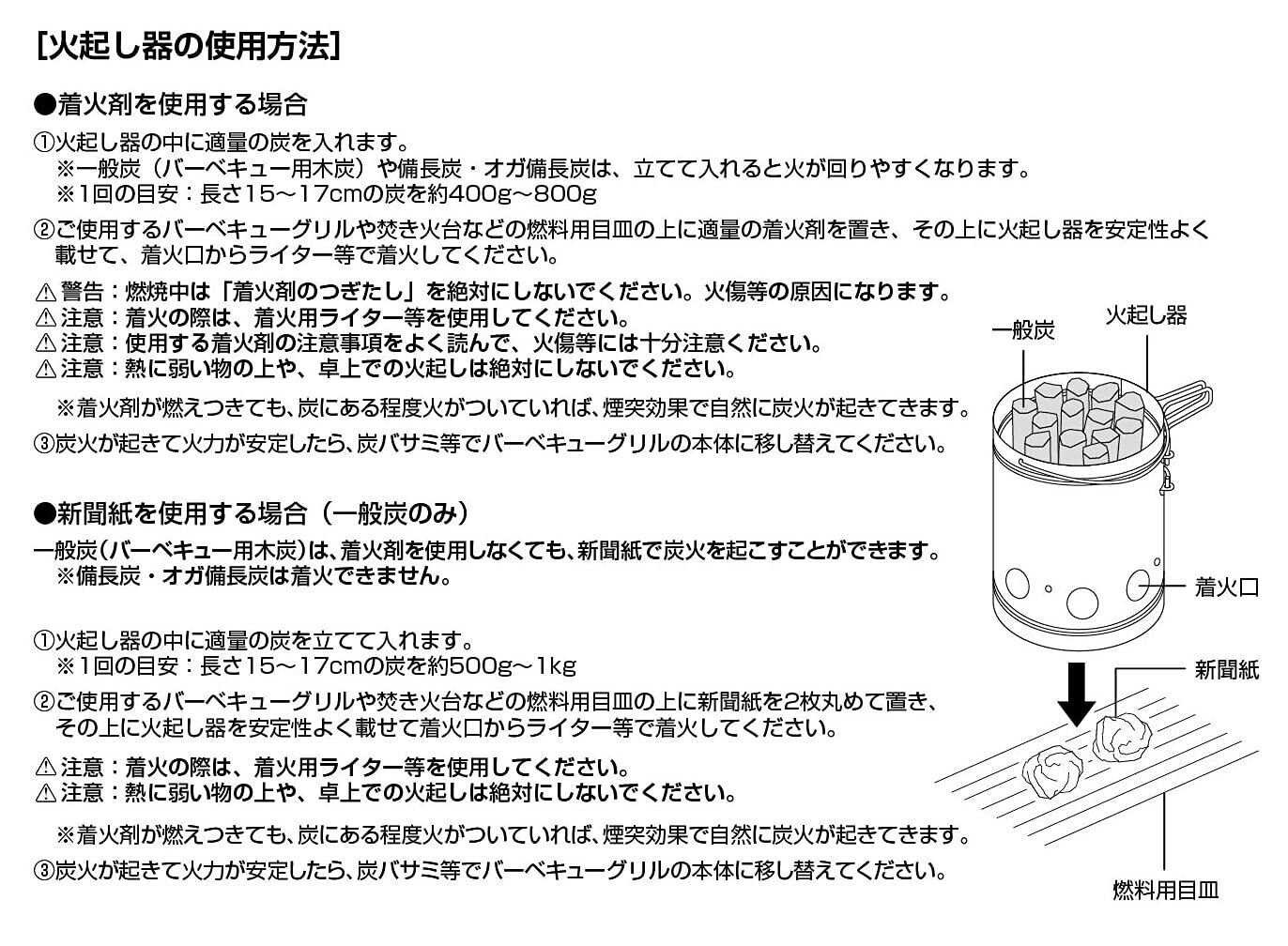 バーベキューに必要な炭火起しが簡単! 火起し器の「煙突効果」によって燃焼効率が向上します。そのため、炭火起しが簡単にできます。備長炭も着火できます。火起し器には便利な着火口付き。ロングライターなどでの着火がスムーズに行えます。煙突効果で簡単に効率良く火が起せます。煙突効果によって火起し器の中で起きる熱対流をより促進、燃焼効率が飛躍的に向上します。■火起し 火消しつぼセットの交換用火起し器として。対応品番:UG-3245/火起し 火消しセット、M-6625/大型火消しつぼ 火起し器セット■別売の火消しつぼに入る火起し器として。対応品番:UG-3251/アルスター火消しつぼ(L)製品サイズ:(約)外径160×高さ200mm(本体のみ)製品重量:(約)540g材質:本体・目皿/アルミめっき鋼板、つる・ハンドル/鉄(亜鉛めっき)原産国:中国レンタル等による貸出、オークション等による販売や中古販売、及び譲渡によって発生した故障・破損・損害・事故などにつきましては一切責任を負いかねますので予めご了承ください。