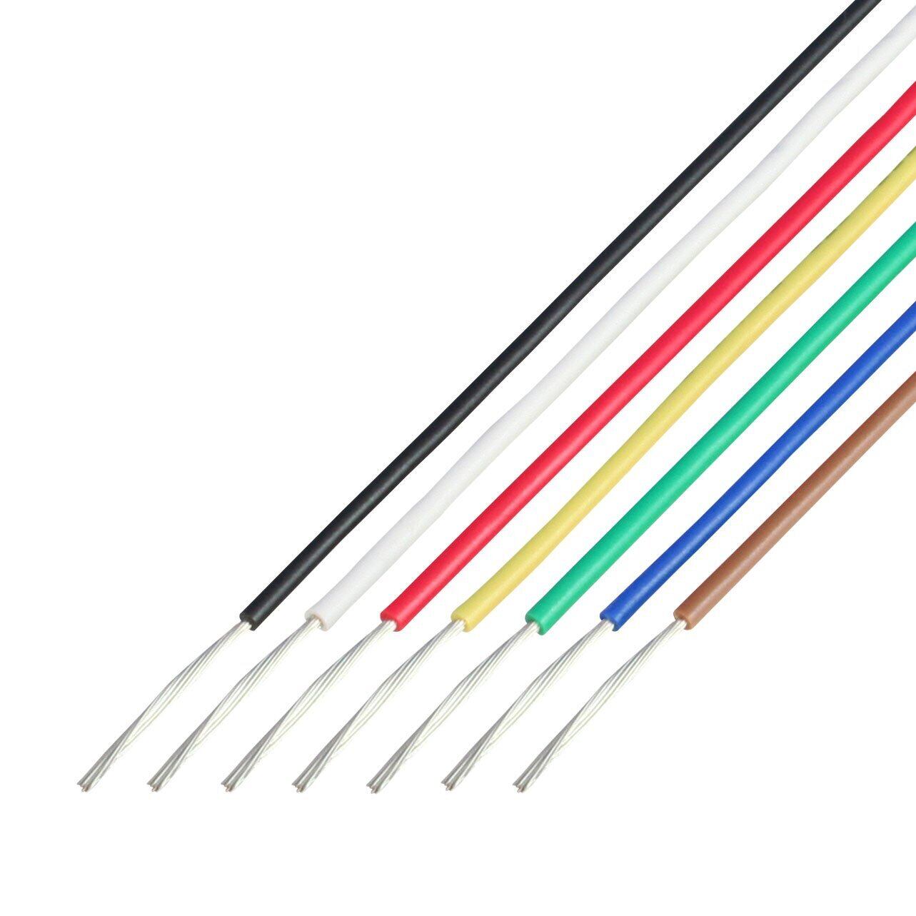 AWG24のUL耐熱ビニル絶縁電線を2mに切断し1袋に7色(黒・白・赤・黄・緑・青・茶)同梱しています。