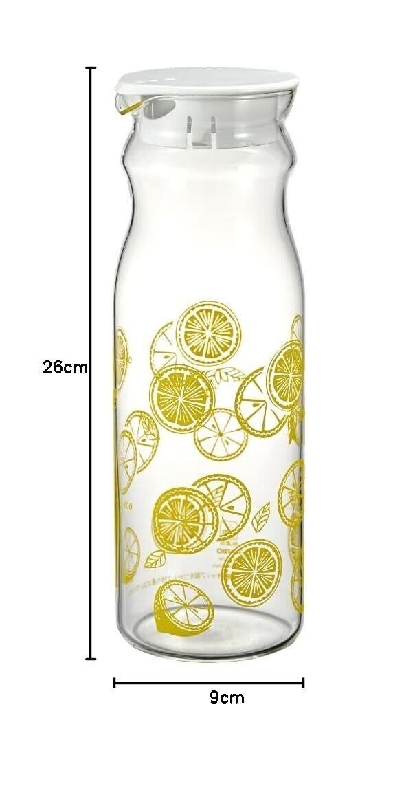 レトロなレモン柄の冷水筒です。お茶パックでお茶を作ったり、フルーツやハーブを入れてフレーバーウォーターを作ったりすることができます。直径9cmの冷蔵庫ドアポケットに入るサイズです。本体上部がくびれ形になっているので、持ちやすく注ぎやすいです。くびれの上までで、1200mL入ります。本体は耐熱ガラスでできているので、熱湯の使用も可能です。フタもポットも食器洗い乾燥機での使用が可能なのでお手入れも簡単です。