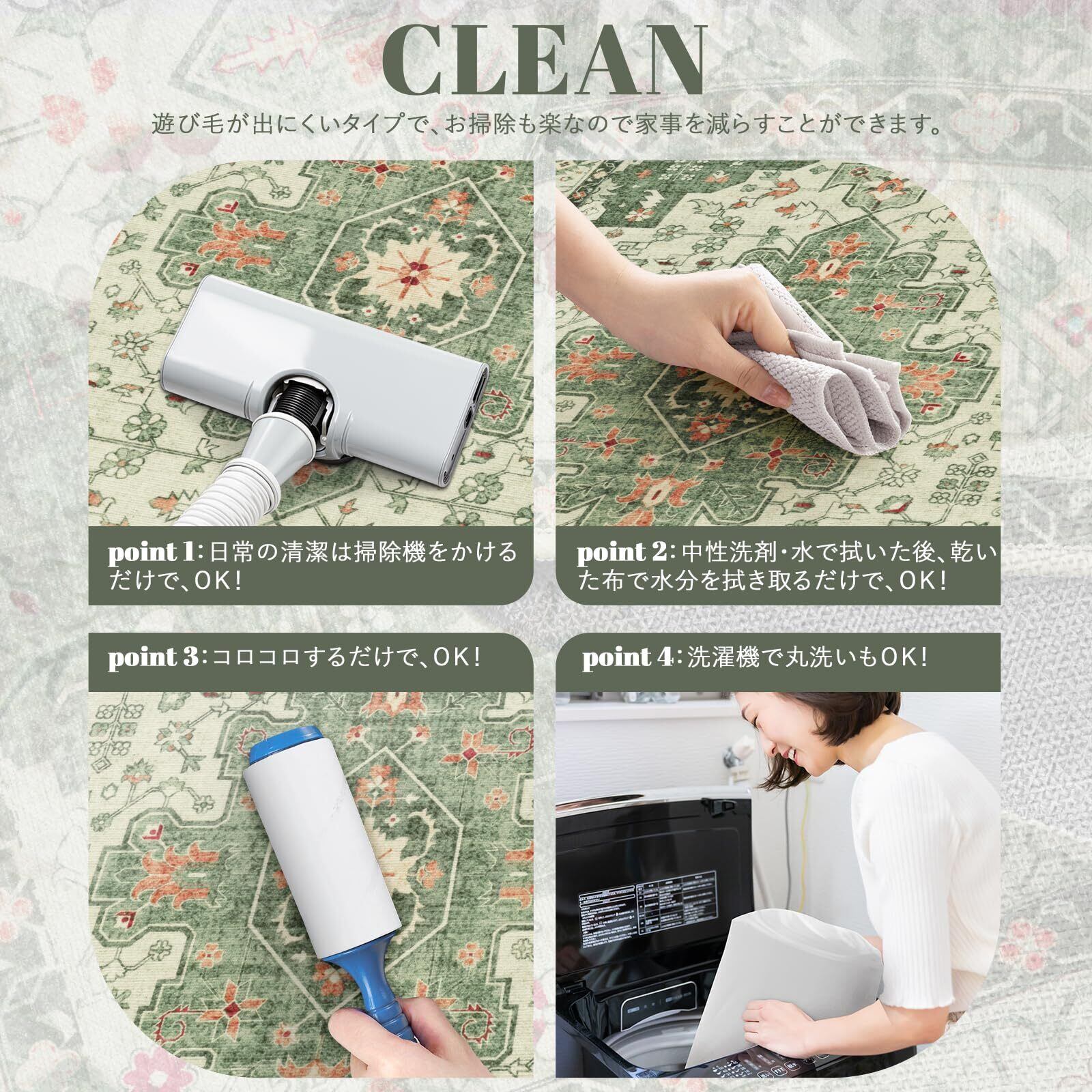 【お手入れ便利】毛足がないので、ゴミが絡みにくく、日常の清潔は粘着クリーナーをコロコロするや掃除機をか けるだけでキレイになります。また、汚れた場合は手洗いや洗濯ネットに入れて洗濯機で洗うことができます(ご 注意:風通しの良いところで陰干しし、アイロン、乾燥機の使用をお避け下さい。)