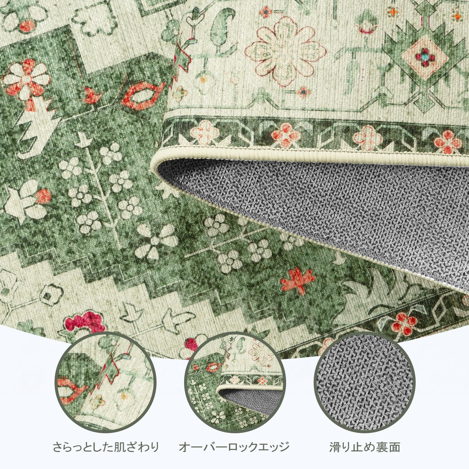 【ペルシャ風デザイン・エレガントな装飾】左右対称のメダリオン・コーナーとアラベスク模様が特徴のペルシャ伝統デザイン。中央のフラワーモチーフがボーダーで縁取られ、芸術的な美しさを演出します。滑らかな肌触りと適度な厚みで、オールシーズン快適に使用可能。おしゃれな装飾性だけでなく、耐久性にも優れています