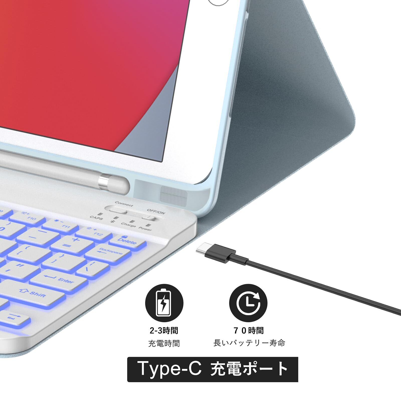 【Type-C充電 & 35間持続使用】ipad 第6世代 9.7インチキーボード付きケース のキーボードはType-C充電式。そして、450mAhのキーボードは2-3時間にフル充電で70時間ぐらい持続使用可能で90日スタンバイです。自動スリープ/省電力機能(10分未使用で作動)で、ipad 9.7 キーボード 本体とiPadのバッテリーを長持ちさせます。(ご注意:初期使用には2時間以上の充電時間が必要。)