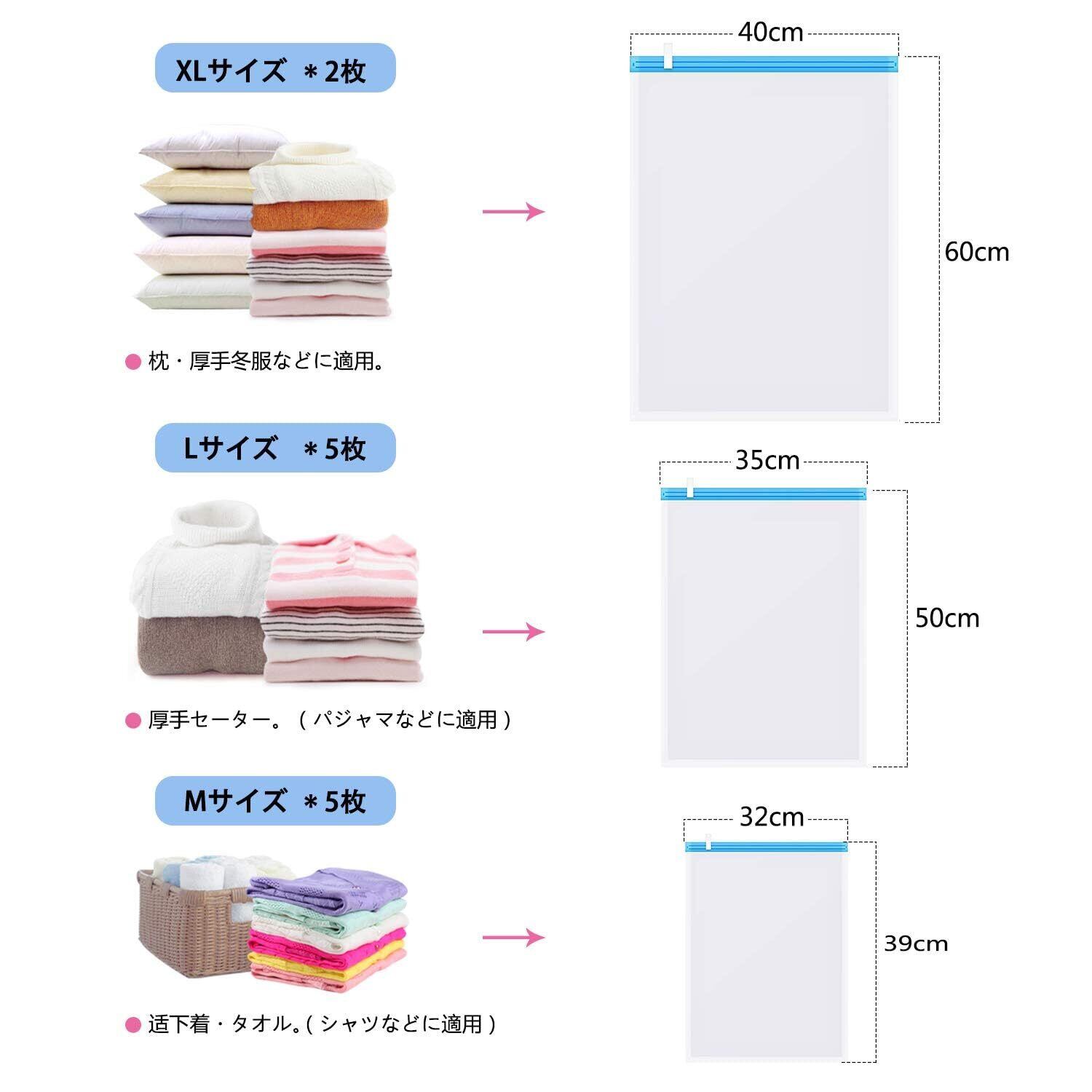 Love-KANKEI 圧縮袋 衣類圧縮袋 12枚入 真空あっしゅく袋 掃除機不要 手巻き 防塵 防湿 防虫 防カビ 再利用可能 衣替え収納 旅行 引越し 出張 家庭用 39*32cm(5枚)+35*50cm(5枚) +40*60cm(2枚)