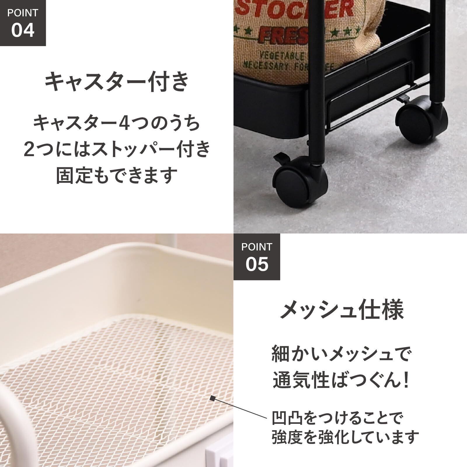 【通気性バツグンのメッシュ仕様】バスケットは細かいメッシュ仕様で小さな物も落ちにくく、通気性ばつぐんです。