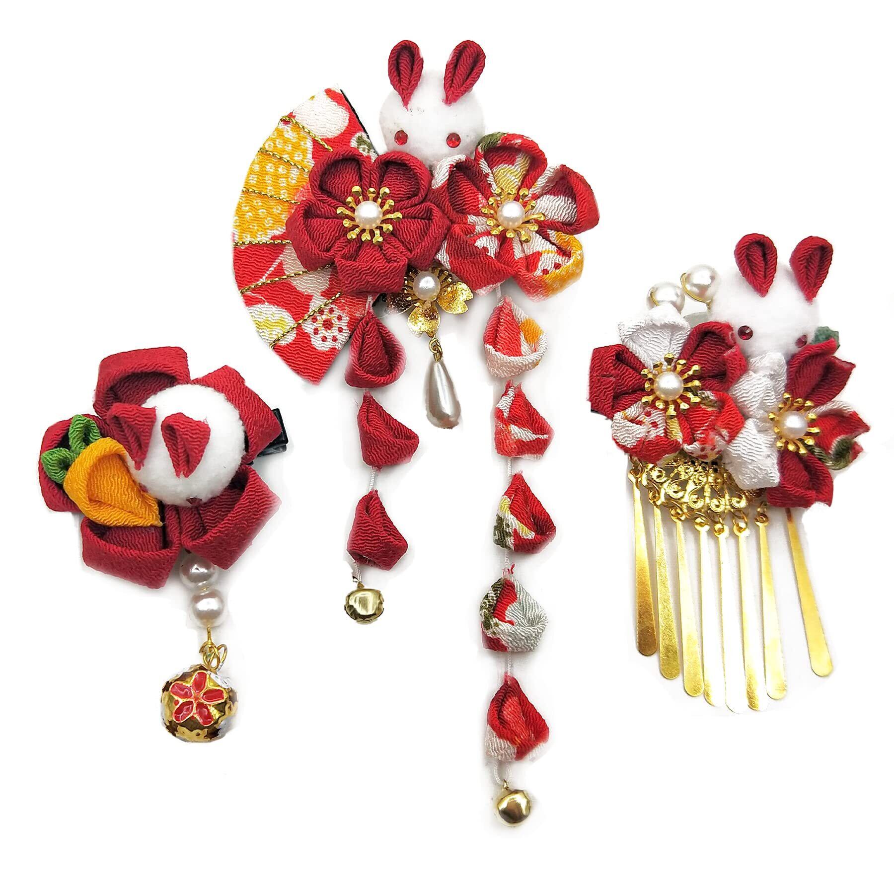 [JZOON] 髪飾り 3点セット 成人式 七五三 浴衣 袴 着物 振袖 和装 つまみ細工 花 卒業式 結婚式 人気 和服 ヘアーアクセサリー かんざし 結納 入学式 発表会 鈴付き 手作り