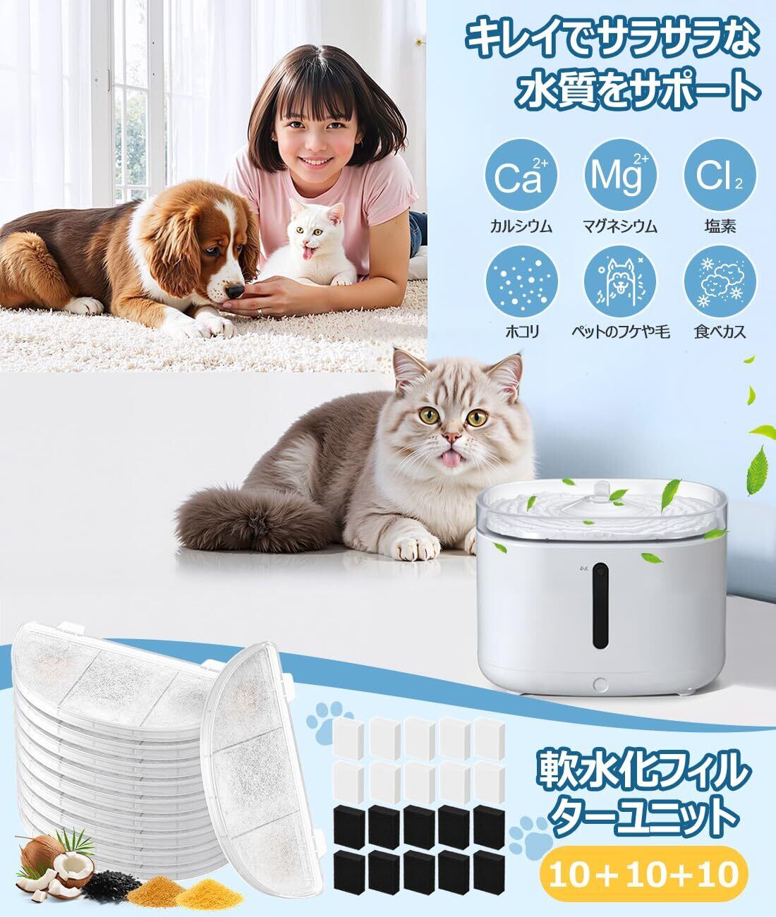 【ヒント】地域によっては水道水にミネラル成分が多く含まれていることがあります。ミネラルが多い水を飲み続けるとワンちゃんや猫ちゃんの胃腸や腎臓、下部尿路などへの健康リスクが高まる可能性があります。浄水ろ過フィルターでミネラルや塩素を大幅にカットし、ワンちゃん猫ちゃんの身体への負担を軽減したおいしいお水を提供します。ABS樹脂製の本体に高密度マイクロ綿、ヤシ殻活性炭、イオン交換樹脂、KDF(銅と亜鉛の合金)を組み合わせた高品質な浄水フィルターです。