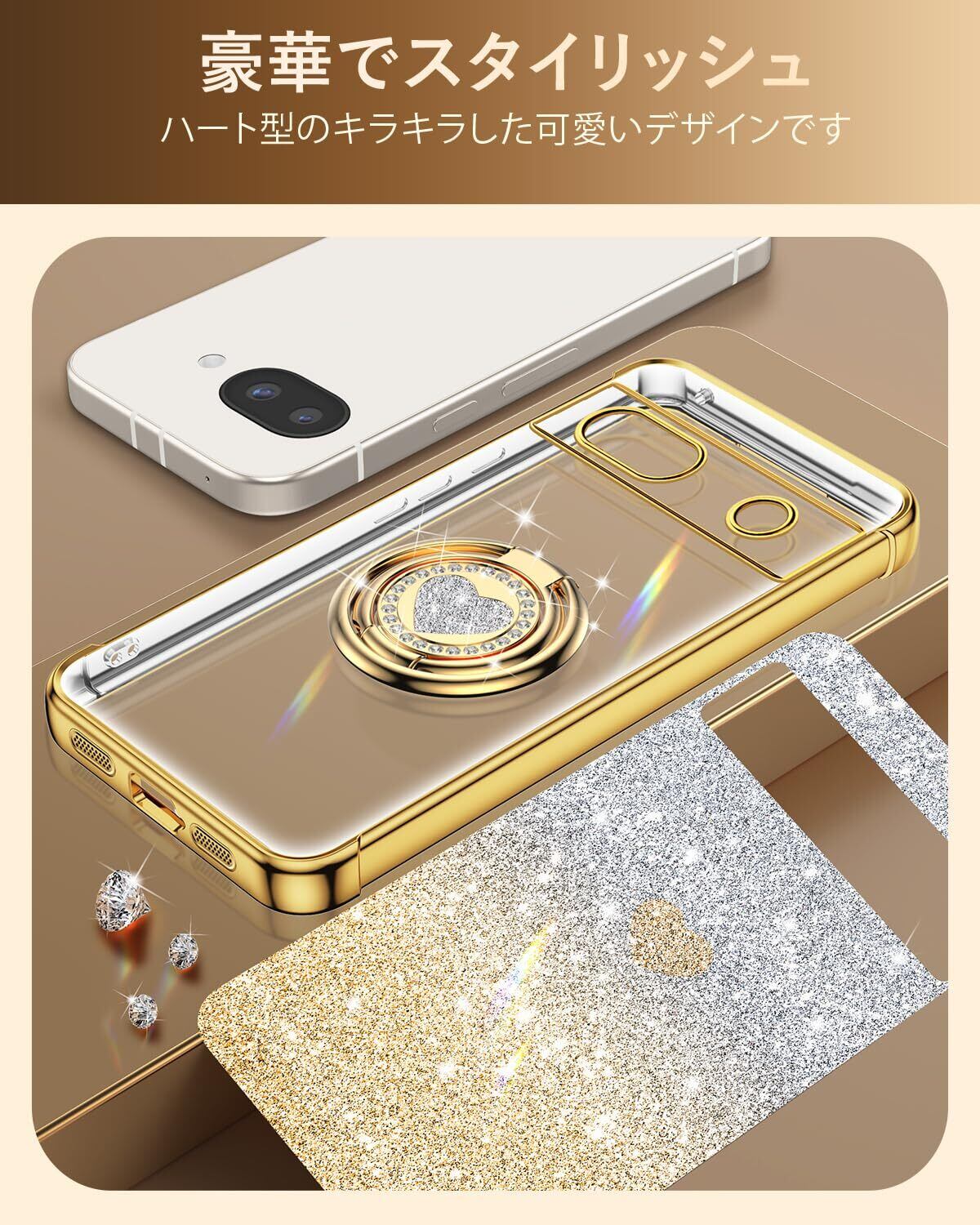 Rockaway Pixel 8A 5G 用 ケース ダブルリング付き リストバンド ブレスレット付き ストラップ 耐衝撃 薄型 軽量 紐付き キラキラ ラブハート かわいい 女の子 おしゃれ 豪華 スマホケース ピクセル8A カバー - ゴールド