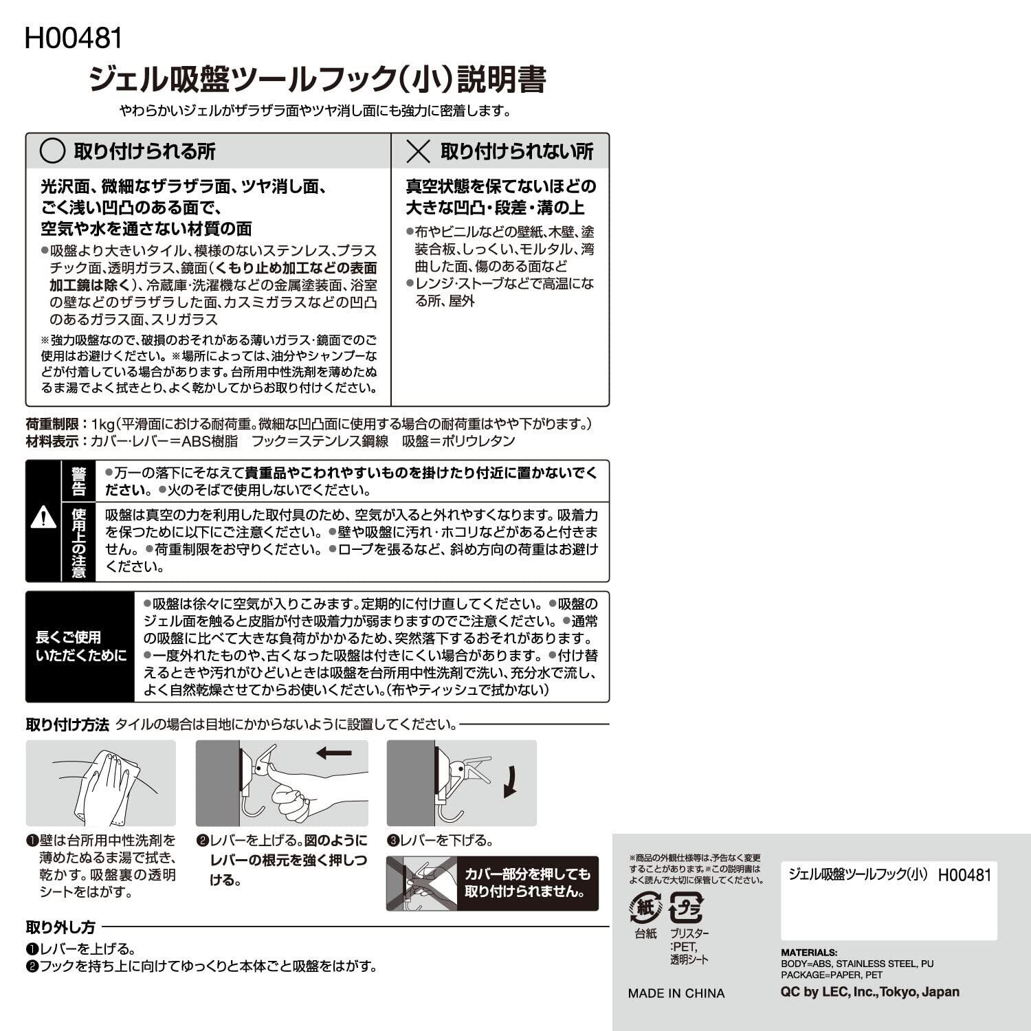【在庫セール】レック(LEC) ジェル吸盤 ツールフック 小 1個入 耐荷重 1kg