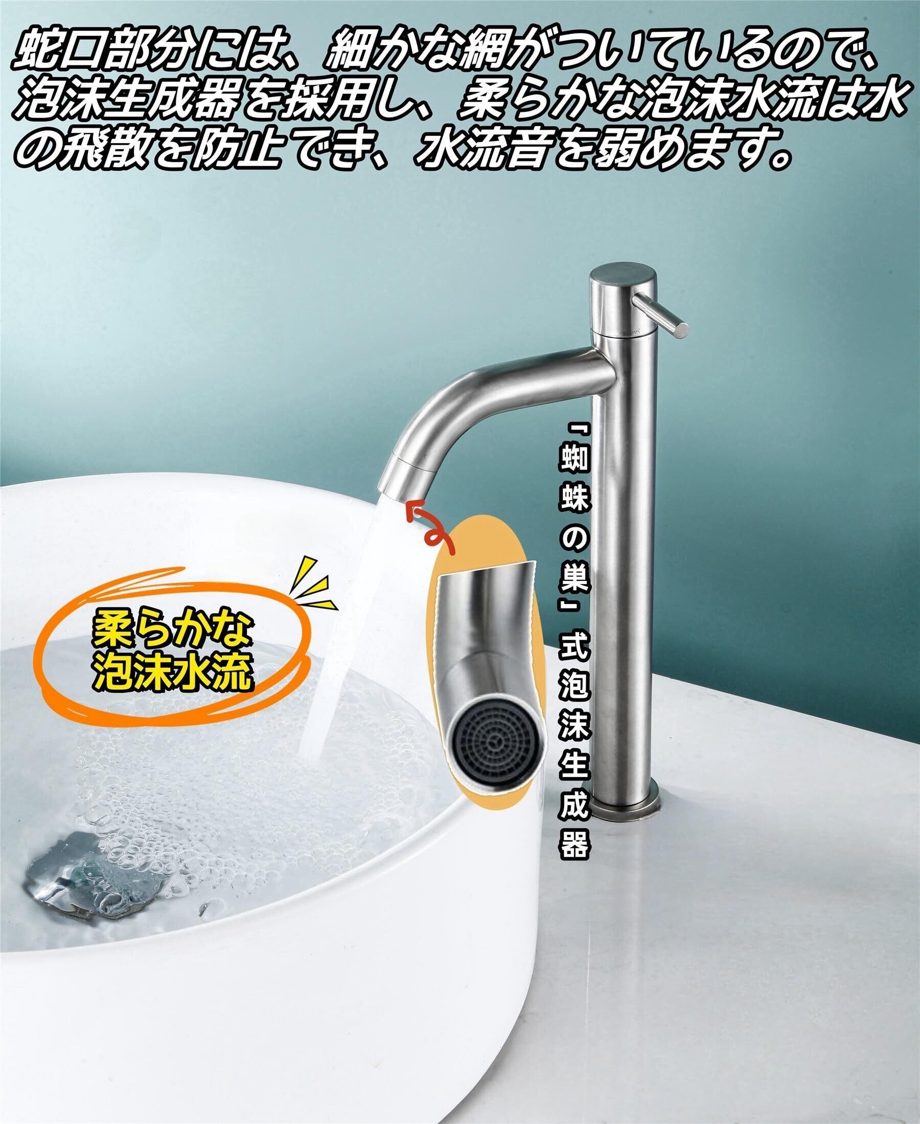【泡沫生成器&飛沫なし】洗面台水栓の注ぎ口は泡沫生成器を採用し、柔らかな泡沫水流は水の飛散を防止でき、水流音を弱めます。シンプルでオシャレなとても使い勝手の良いステンレス製のシングルレバー立水栓です!