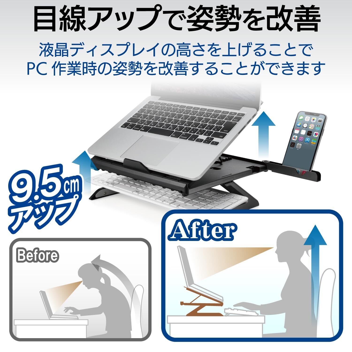 エレコム ノートPCスタンド 折りたたみ 8段階 9.5cm高さアップ脚 スマホスタンド付 ~15.6インチノートPC対応 折りたたみ時サイズ:幅280×奥行280×高さ26mm 耐荷重:10kg ブラック PCA-LTSH8BK
