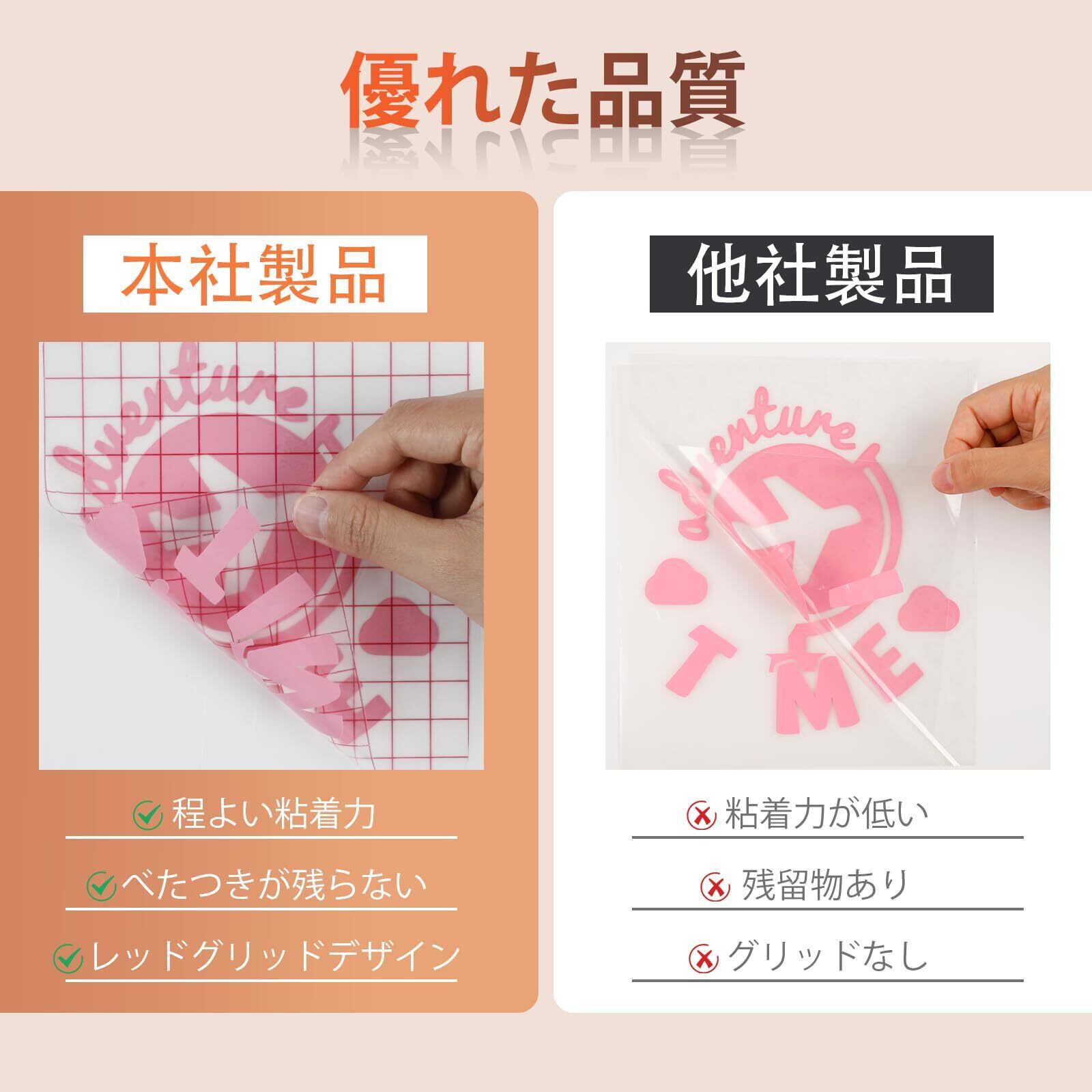 【品質について】PET樹脂となっており加工性と汎用性が高い素材です。エコ素材で、リサイクル可能、体にも優しいタイプ。透明フィルムタイプ、視認性に優れており、作業がしやすい転写シートです。1/2in(約1.25cm)サイズのレッドグリッド加工、正確にカットしやすい!初心者の方にもお勧めです。