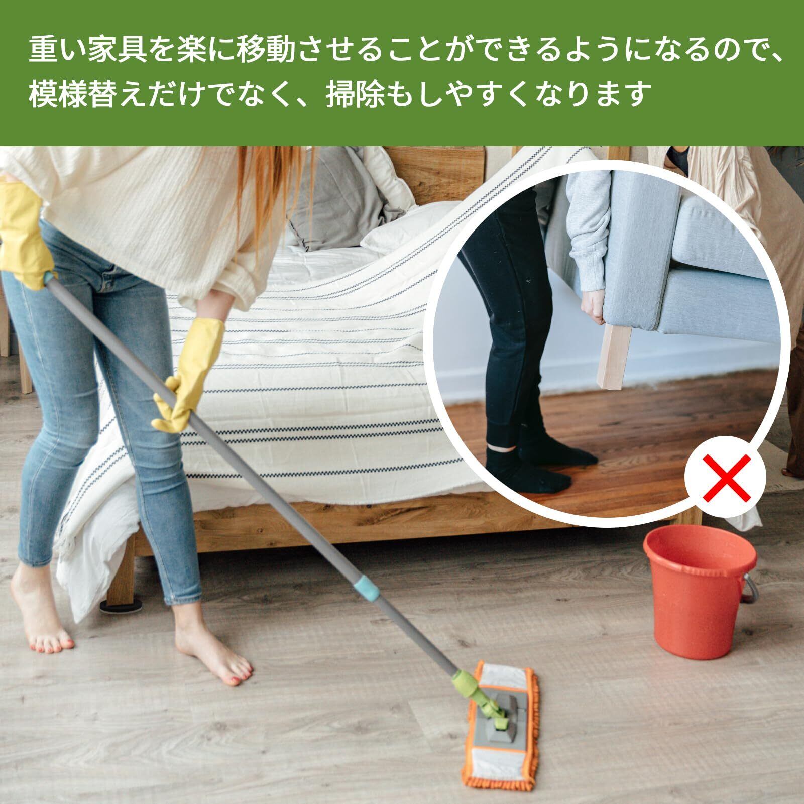【楽々移動】フェルトスライダーを使用する時、EVAォームを家具の足に接触させ、フェルトを床に接触させます。この家具スライダーを使用すると、ソファ、テーブル、ベッドなどの重い家具が楽々に移動できます。また、掃除や模様替えが一人でも気軽にできるようになります。