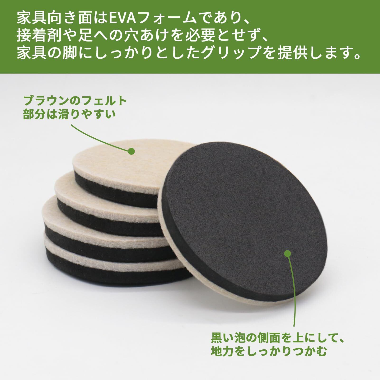 【高品質】耐磨耗性のあるフェルトを採用して作られた家具スライダーが頻繁に家具に使用しても大丈夫です。家具向き面はEVAフォームであり、ソフトで床への圧力を減らします。高品質素材を使用しており繰り返し利用することができます。当社のウッドフロア用スライダーには、厚手のフェルト、ゴムフォームを使用しています。 硬材用のスライダーの上部に接着部はありません。ゴムのフォームが家具をしっかりとずれないように固定しますので、長時間維持されます。