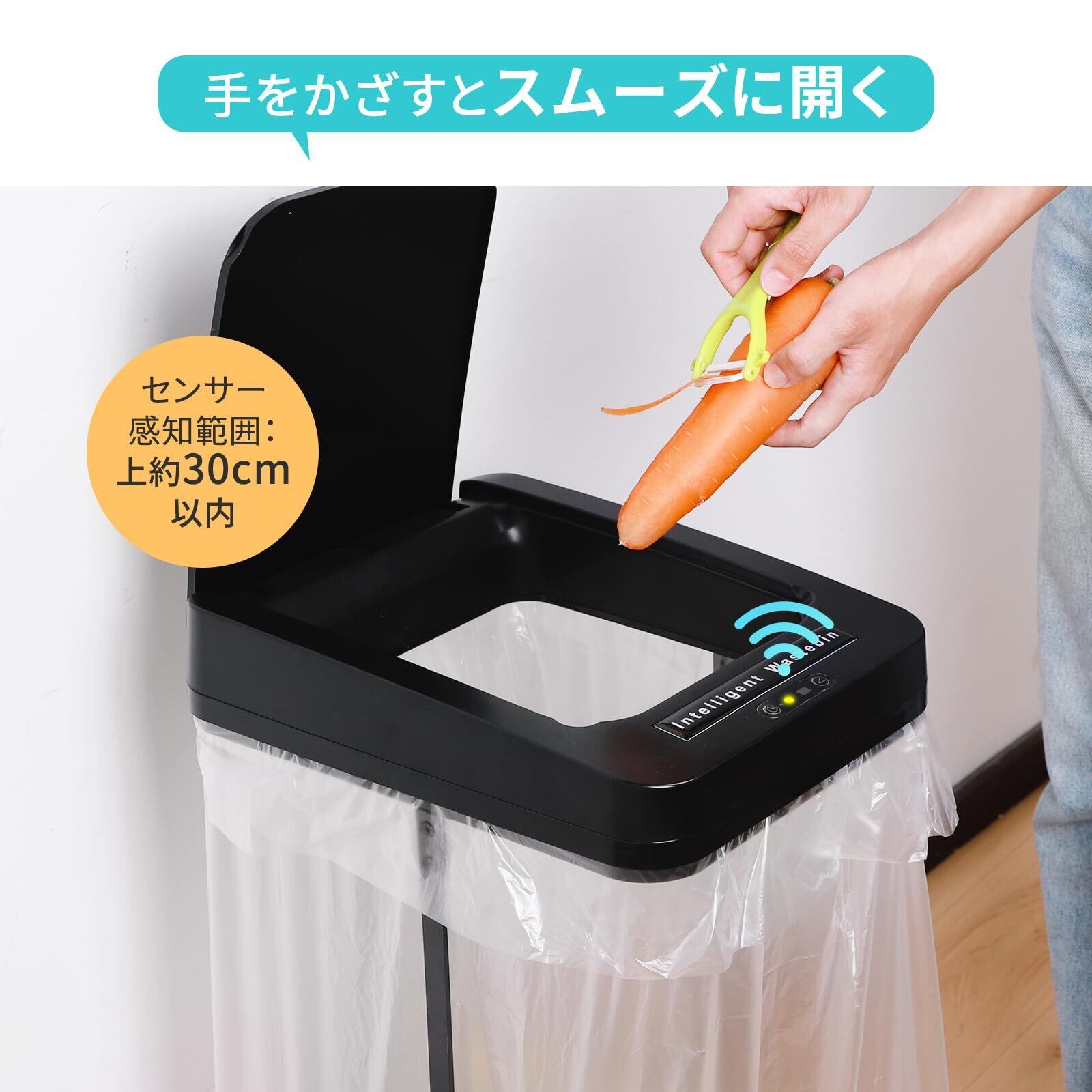 【自動センサー×ゴミ袋ホルダー】ご注意:蓋操作パネルの表面に透明保護フィルムを剥がせる。センサーの上方30cm付近に手をかざすと自動でフタが開き、約5秒後にフタが閉まります。不要な接触を控えることができるため衛生的です。両手がふさがっていてもフタが自動開閉するので、楽にごみ捨てができます。ボタンを押すと手動でも開閉可能、蓋を開けたままで作業したい時に便利です。一般的なゴミ箱と違って、外装がなく中身が見えるタイプで、ゴミの溜まり具合が一目瞭然なので、捨てるタイミングも計りやすいです。