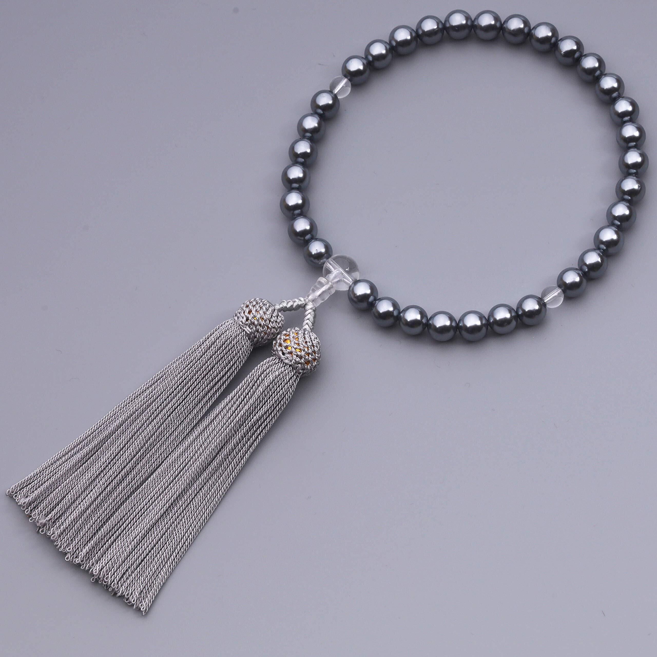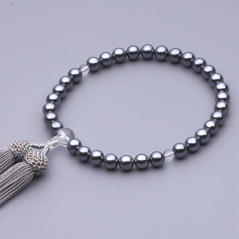 主玉:黒貝パール8mm、天玉:本水晶6mm 親玉:本水晶10mm 頭付房(グレー)